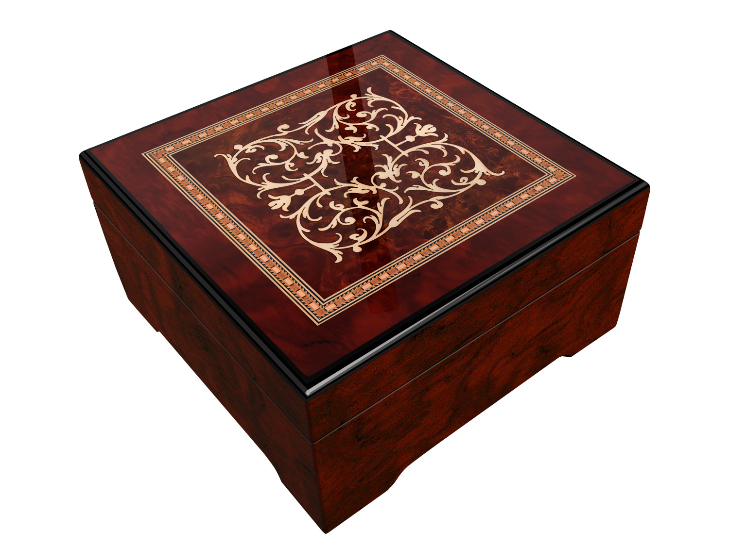 Muzikale sieradendoos in vierkante uitvoering. Deze hoogwaardig afgewerkte sieradendoos is gedecoreerd met een zogenoemd "Rankenintarsie". Een prachtig stukje Duits vakmanschap. Intarsia is een vorm van inlegwerk in hout. Deze oppervlaktetechniek kenmerkt zich doordat de ingelegde materialen in een massief vlak verwerkt zijn. Er wordt daartoe eerst materiaal uit het vlak verwijderd wat vervolgens ingelegd wordt met hout. Door schuren en/of slijpen wordt daarna het oppervlak weer glad gemaakt.