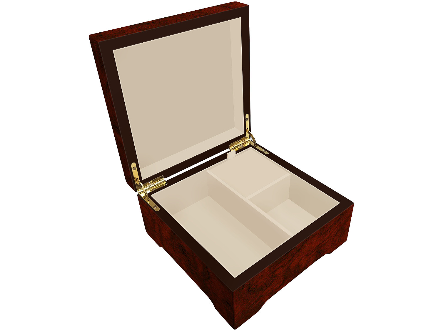 Deze doos is voorzien van twee opbergvakken die ruimte bieden voor allerlei sieraden. De gehele binnenzijde is gestoffeerd met een crèmekleurige velours. Aan de rechterzijde bevindt zich onder het afneembare afdekplaatje het 18-tonige Böhme speelwerk dat is gemaakt van goudkleurig metaal. Het plaatje kan eenvoudig worden verwijderd om de werking van het mechanisme te bekijken. Aan de onderzijde, die is bekleed met een bordeauxrode velours, zit een vleugelmoer om het mechanisme mee op te winden. Als vervolgens het deksel van de doos wordt geopend begint de melodie te spelen, na sluiting stopt deze ook weer.