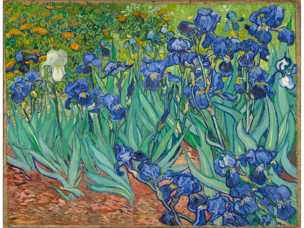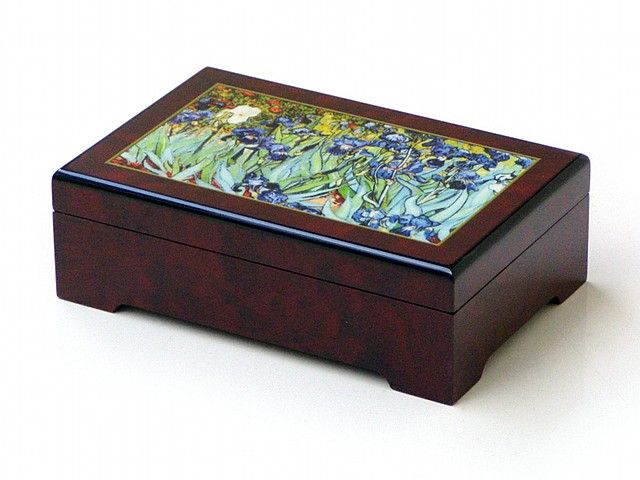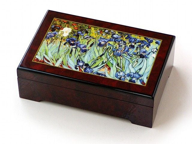 Muzikale sieradendoos in rechthoekige uitvoering. Deze hoogwaardig afgewerkte sieradendoos is voorzien van een prachtige afbeelding van het beroemde schilderij 'Irissen'uit 1889 van de Nederlandse kunstschilder Vincent van Gogh.