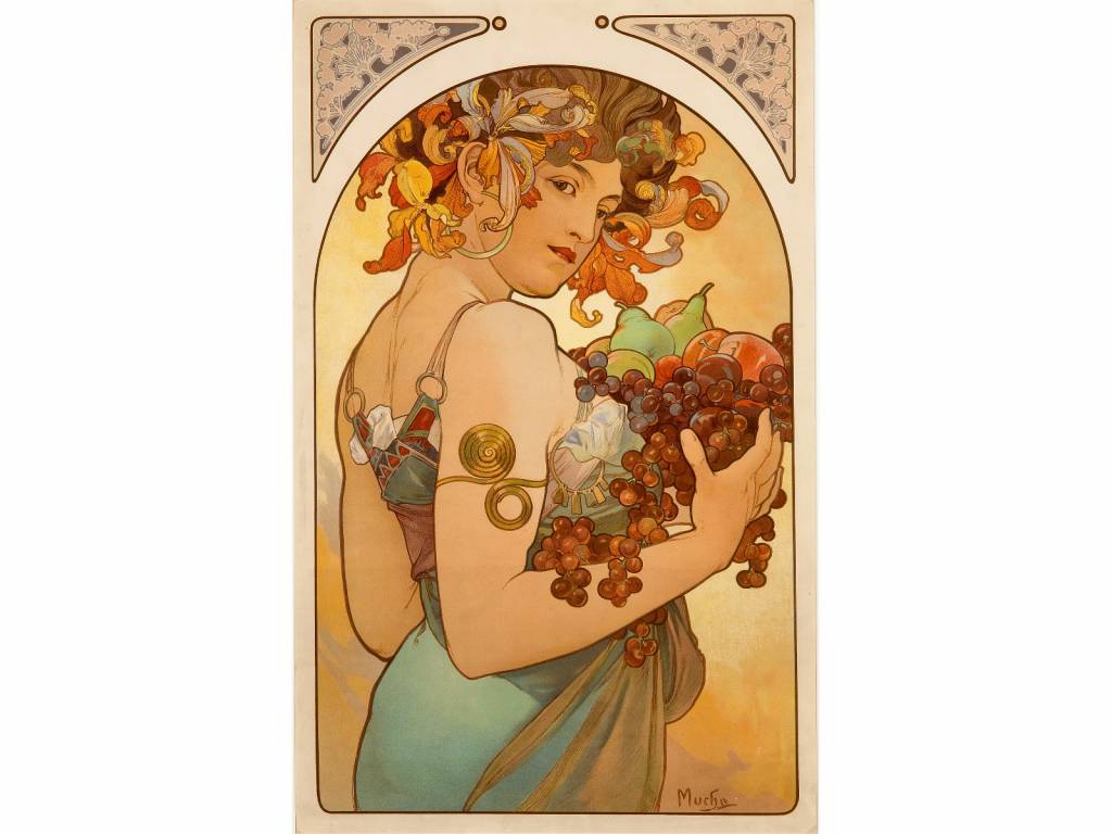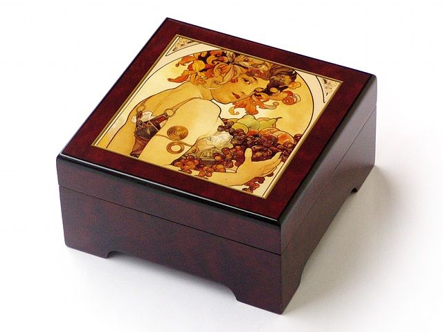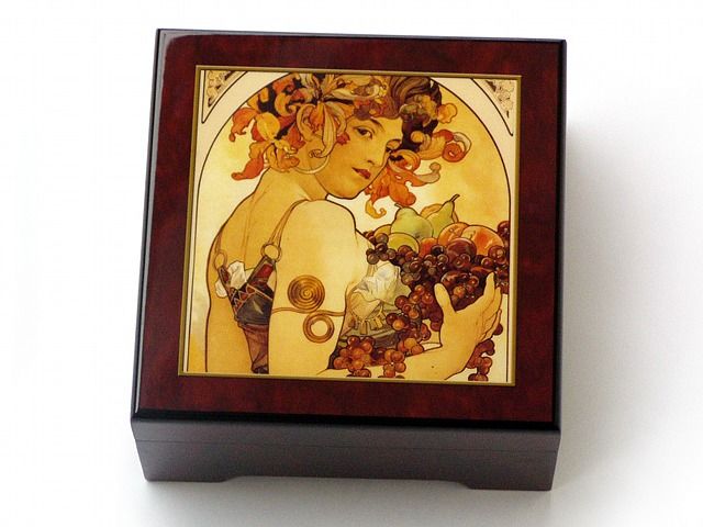 Muzikale sieradendoos in vierkante uitvoering. Deze hoogwaardig afgewerkte sieradendoos is voorzien van de prachtige afbeelding getiteld 'Fruit'uit 1897 van de Tsjechische kunstenaar Alphonse Maria Mucha. Vooral bekend vanwege zijn ontwerpen voor affiches en wandplaten welke onlosmakelijk verbonden zijn met de Jugendstil kunststroming, populair aan het begin van de twintigste eeuw.