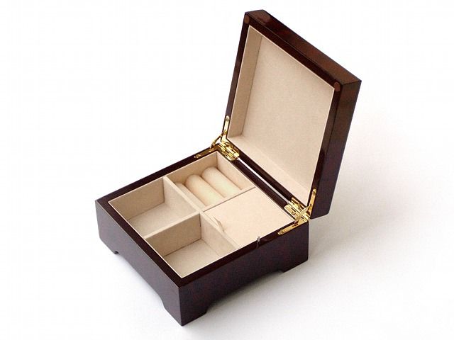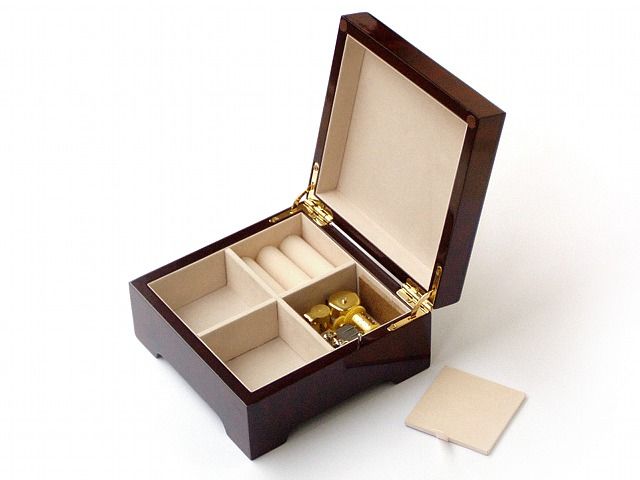 De binnenzijde van de doos is gestoffeerd met een crèmekleurige zachte velours. Daarnaast is hij voorzien van vakverdeling voor verschillende sieraden, waaronder een gedeelte voor ringen. Het 18 tonige Böhme speelwerk is van goudkleurig metaal en wordt afgedekt door een klein plaatje. Dit kan eenvoudig weer worden verwijderd om de werking ervan te bekijken. Aan de onderzijde, die is bekleed met een bordeauxrode velours, zit een vleugelmoer om het mechanisme mee op te winden. Als vervolgens het deksel van de doos wordt geopend begint de melodie te spelen, na sluiting stopt deze ook weer.