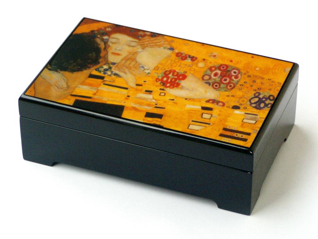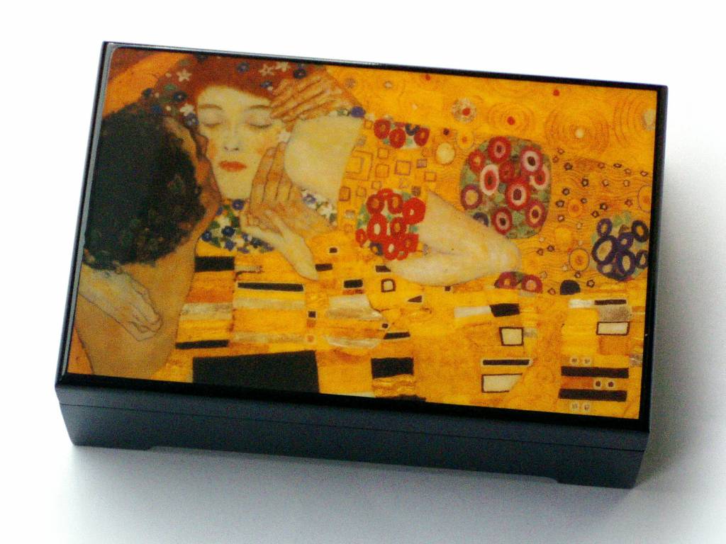 Muzikale sieradendoos in rechthoekige uitvoering. Deze hoogwaardig afgewerkte sieradendoos is voorzien van een uitsnede van het prachtige schilderij 'Der Kuss' (De Kus) van de Oostenrijkse kunstschilder Gustav Klimt, dat hij maakte in de periode 1912 - 1913. Het is een van zijn bekendste werken alsook van de Jugendstil kunststroming waartoe hij werd gerekend.