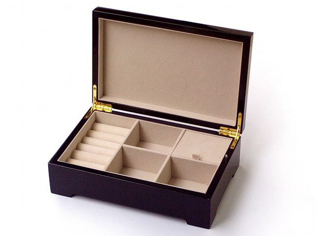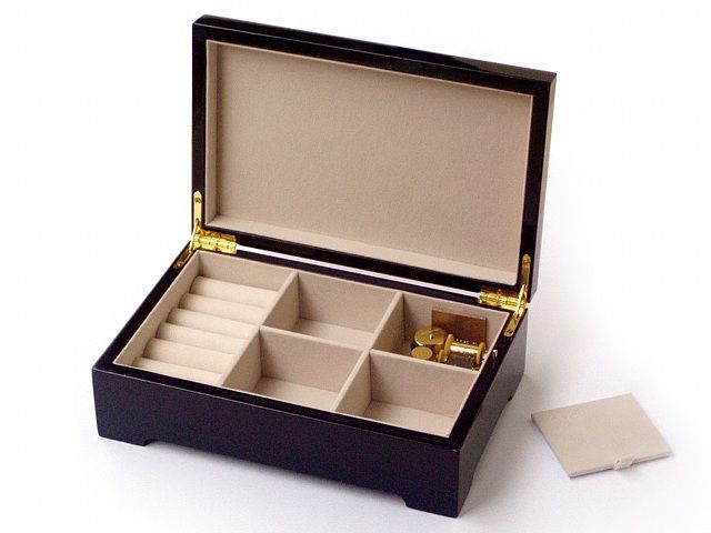 De binnenzijde van de doos is gestoffeerd met een crèmekleurige zachte velours. Daarnaast is hij voorzien van vakverdeling voor verschillende sieraden, waaronder een gedeelte voor ringen. Het 18 tonige Böhme speelwerk is van goudkleurig metaal en wordt afgedekt door een klein plaatje. Dit kan eenvoudig weer worden verwijderd om de werking ervan te bekijken. Aan de onderzijde, die is bekleed met een bordeauxrode velours, zit een vleugelmoer om het mechanisme mee op te winden. Als vervolgens het deksel van de doos wordt geopend begint de melodie te spelen, na sluiting stopt deze ook weer.