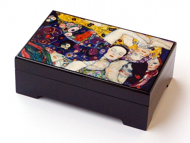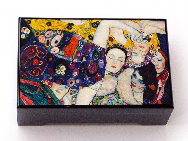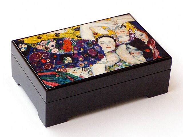 Muzikale sieradendoos in rechthoekige uitvoering. Deze hoogwaardig afgewerkte sieradendoos is voorzien van een uitsnede van het prachtige schilderij 'Die Jungfrau'(De Maagd) van de Oostenrijkse kunstschilder Gustav Klimt dat hij maakte in de periode 1912 - 1913.
