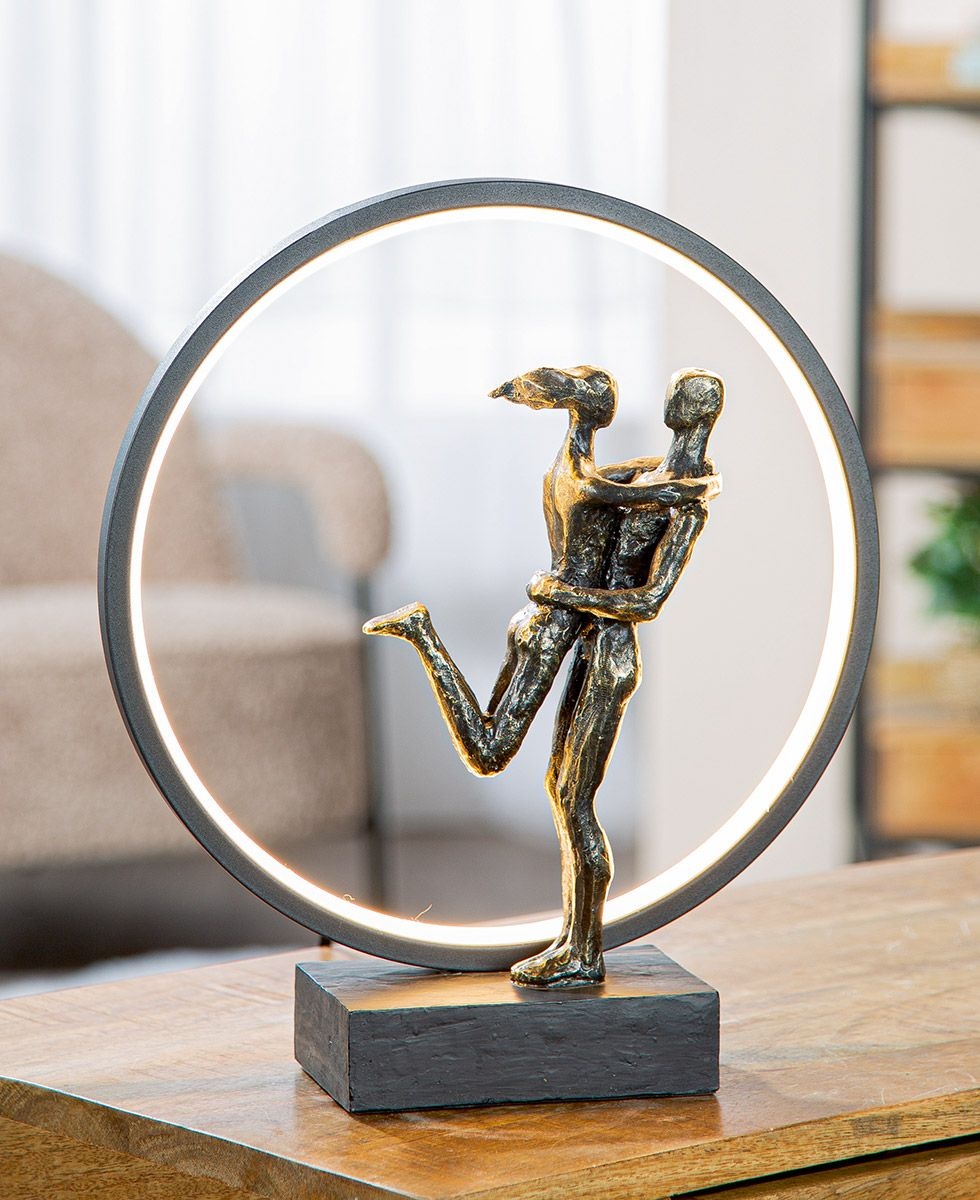 Modern sculptuur waarbij een vrouw opgewonden van vreugde in de armen springt van een man. Blij dat ze elkaar na lange tijd weer zien. Een herkenbare liefdevolle actie bij een open cirkel voorzien van LED verlichting. Een reünie die geluk brengt, symbolisch weergegeven door het licht.