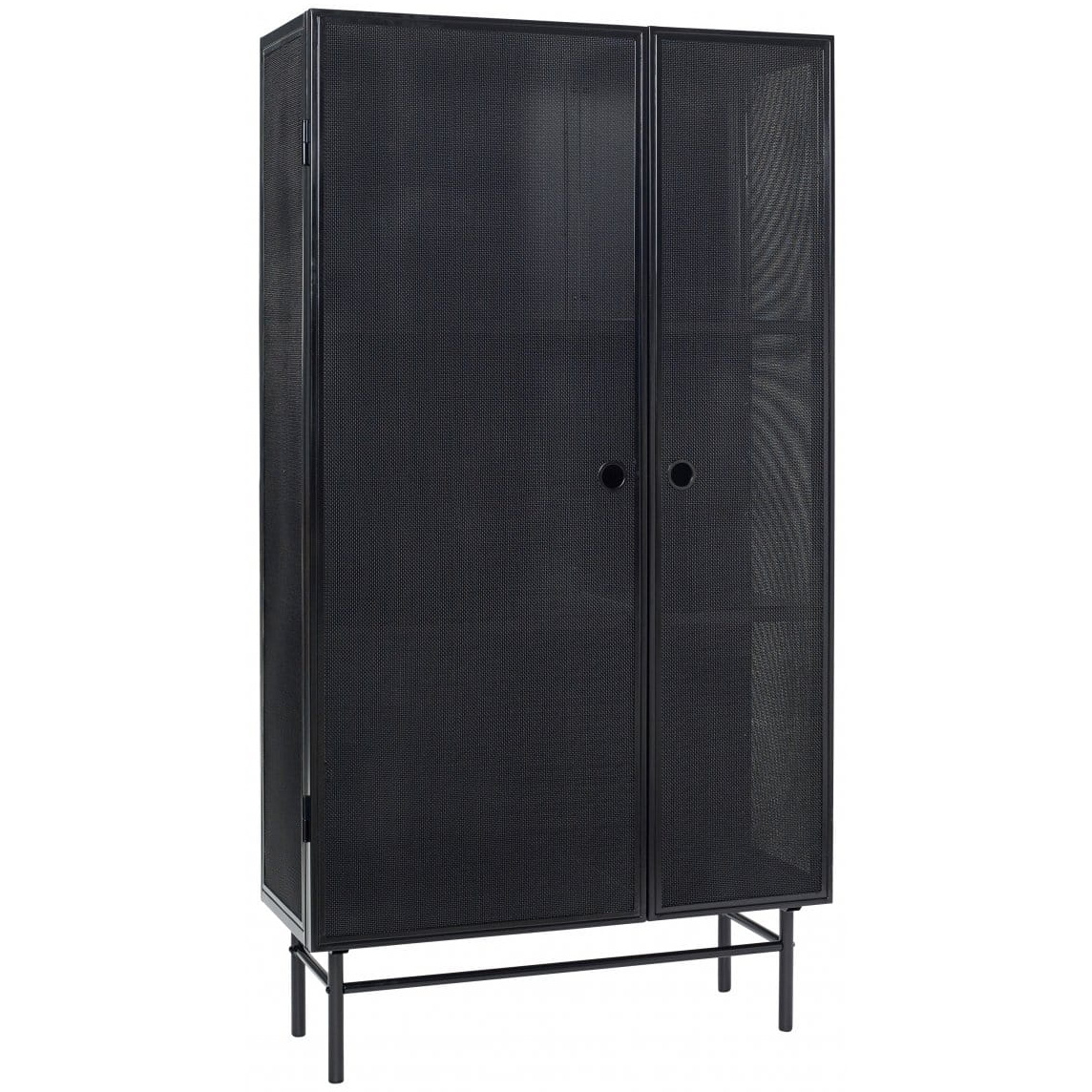 Zwart metalen kast met 2 deuren en 3 lagen. Prachtig Deens design in optima forma. De deuren en zijkanten van de kast zijn van zeer fijn gevlochten metaal waardoor de kast een trendy uitstraling krijgt. De 2 openslaande deuren zijn niet identiek, ze verschillen in de breedte van afmeting, dit asymmetrische effect verhoogd de decoratieve uitstraling!