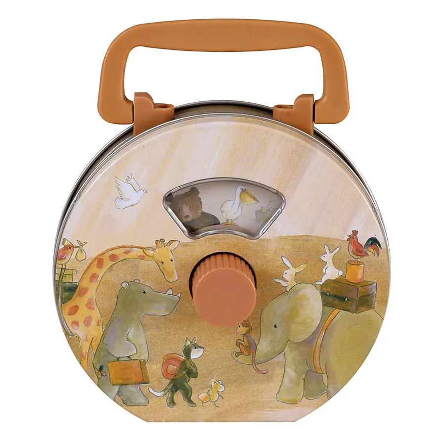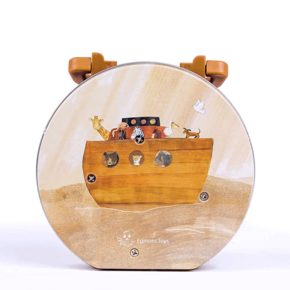 Draai aan de bruine knop en zie hoe allerlei verschillende dieren tot leven komen achter het doorzichtige venster. Een parade van onder andere giraffen, nijlpaarden, konijnen, olifanten en aapjes komen voorbij om plaats te nemen in de ark. Iedereen heeft bagage bij zich, want het verblijf op de ark kan lang duren!