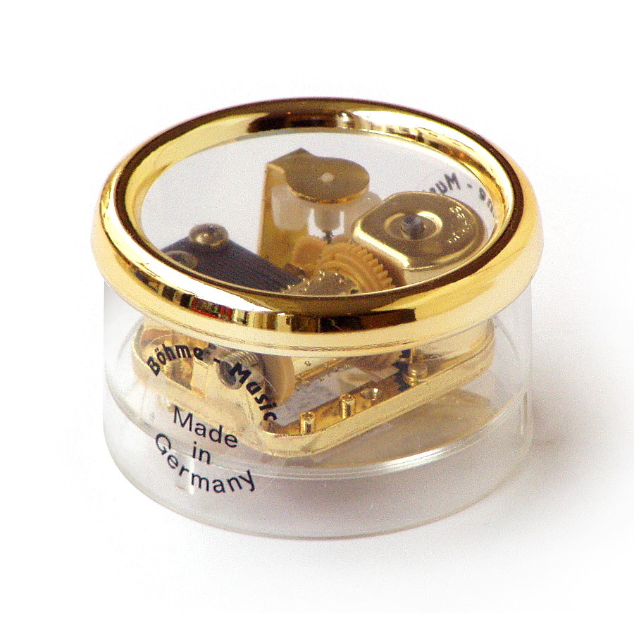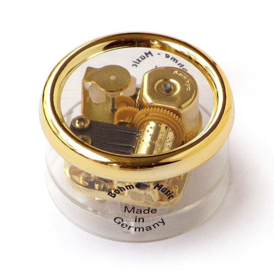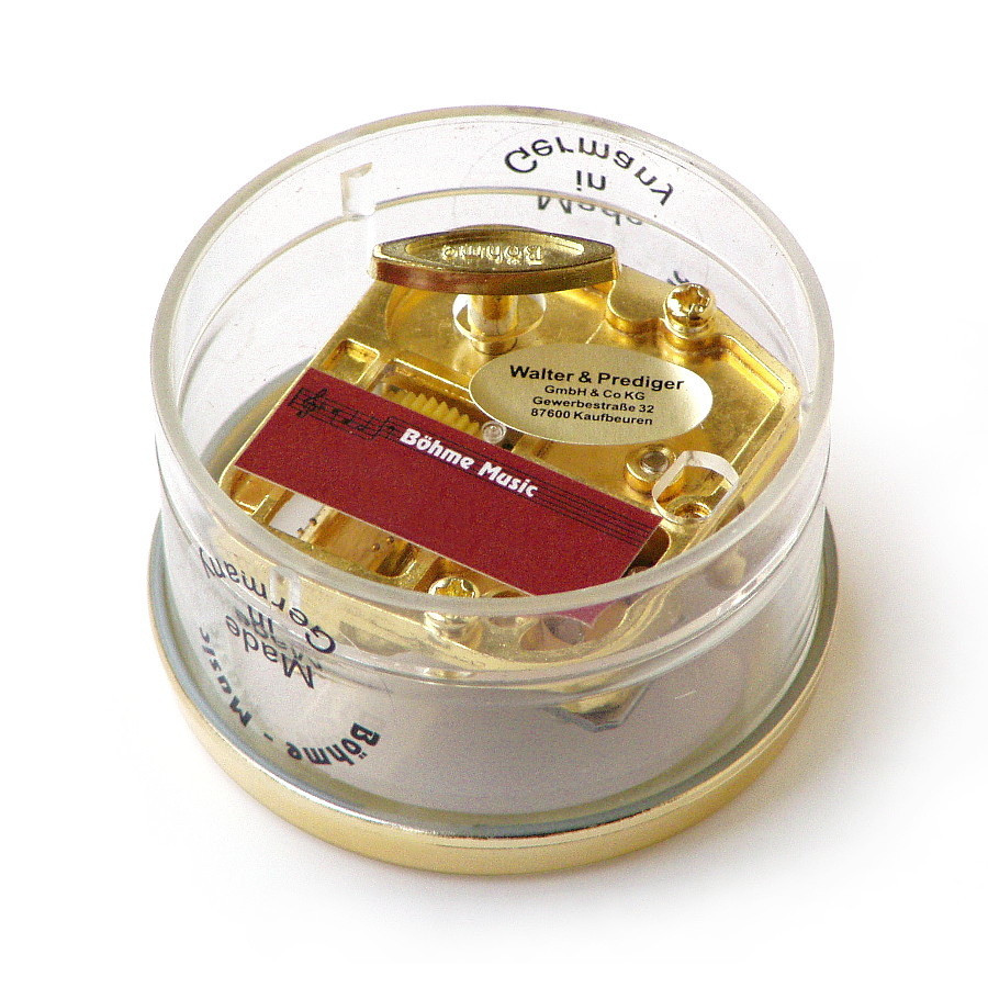 Klein rond muziekdoosje voorzien van opwindbaar muziekmechanisme. Gemaakt in Duitsland van helder transparant acrylaat en voorzien van een goudkleurige rand van kunststof. Ook het metalen speelwerk of muziekmechanisme is goudkleurig. Op de onderzijde is een bordeauxkleurige sticker aangebracht waarop de titel van de melodie staat aangegeven. Het doosje is in twee delen uit elkaar te halen zodat er eventueel een zelf gekozen afbeelding achter het venster geplaatst kan worden. Zo creëer je een persoonlijke, muzikale attentie voor je beste vriend of vriendin, of voor jezelf.