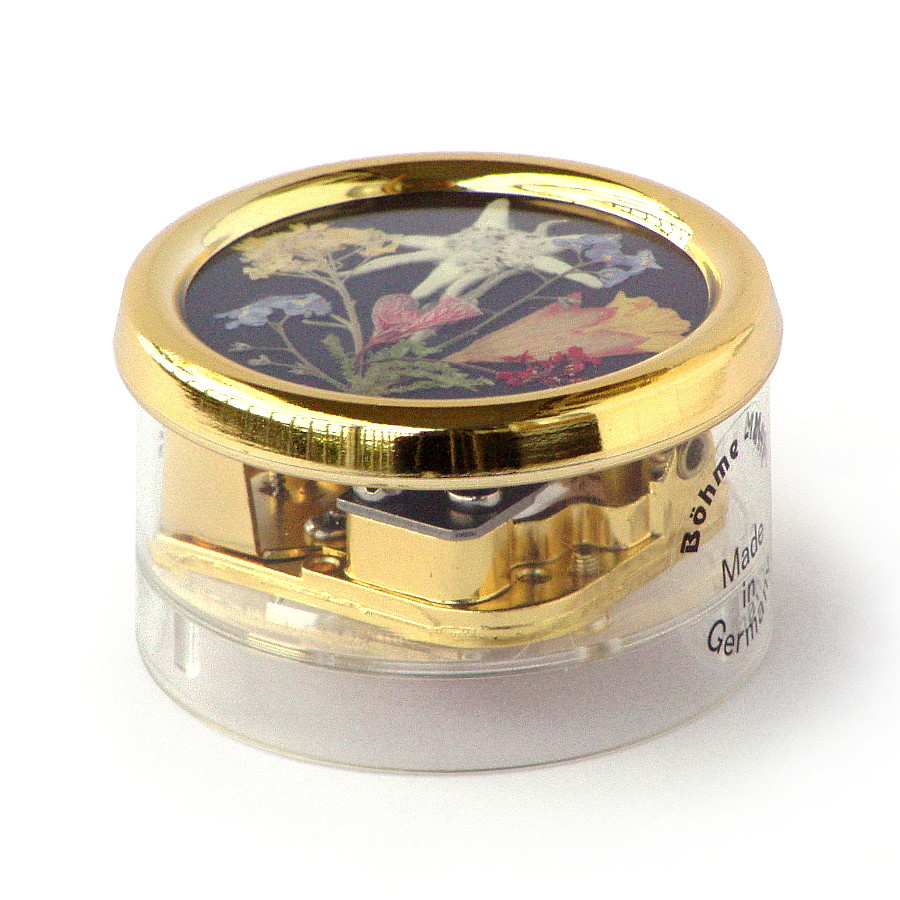 Klein rond muziekdoosje voorzien van een opwindbaar muziekmechanisme en gedecoreerd met een fraaie afbeelding van een veldboeket op een zwarte ondergrond met daar bovenop een echte gedroogde Edelweiss (iets anders dus dan op de foto's waar alle bloemen gedroogd zijn!). Het gehele boeket is samengesteld met typische bloemen uit Tirol, zo ook de magische Edelweiss. Deze kleine bloemen zijn dus allemaal te vinden in de Alpen, het berggebied dat loopt van Frankrijk door Zwitserland, Italië, Oostenrijk en Duitsland tot in Slovenië.