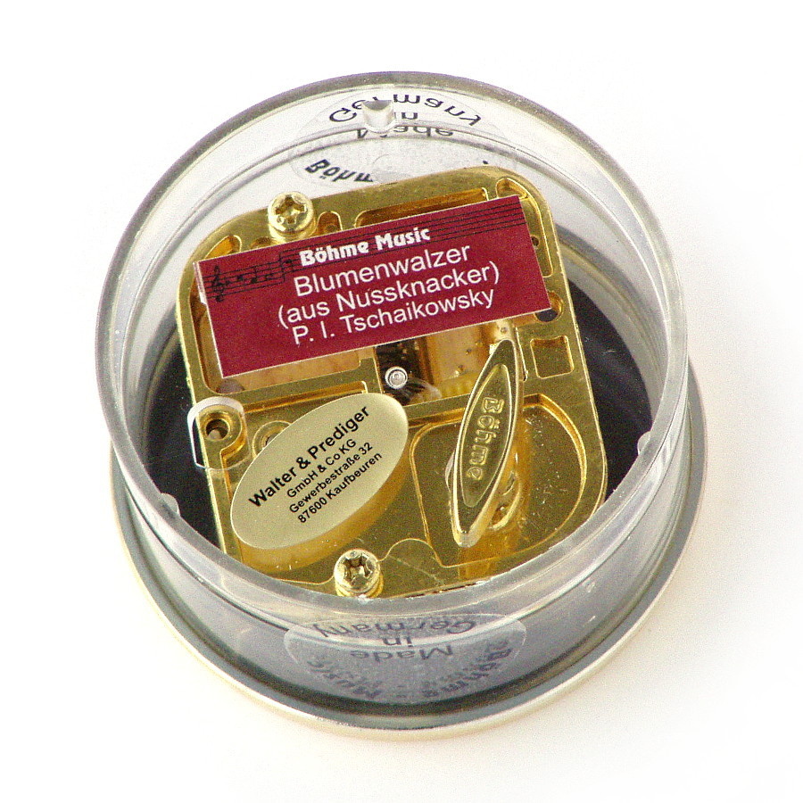 Na het opwinden van het mechanisme met de vleugelmoer aan de onderzijde klinkt het 18-tonige muziekmechanisme.