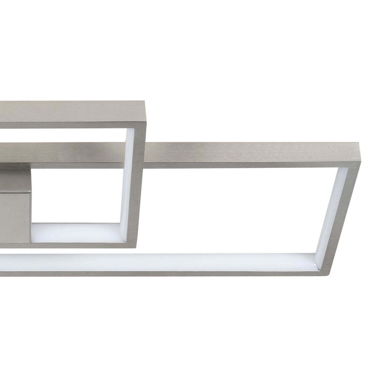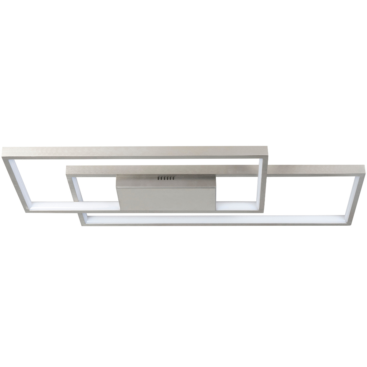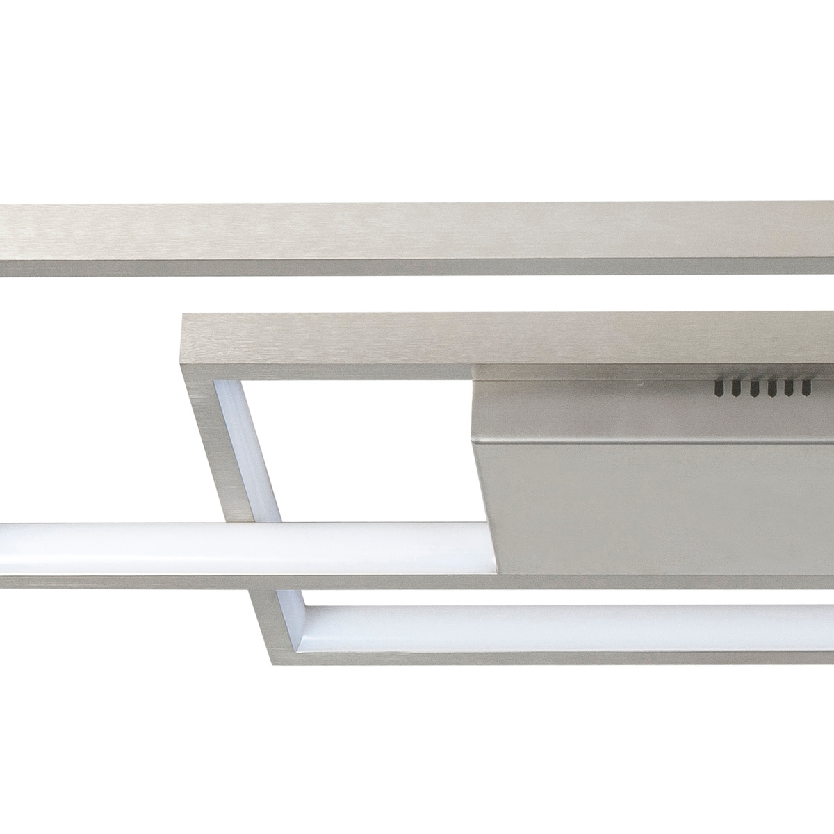 Moderne, LED design plafondlamp uit de Piazza serie. Een plafonnière waarbij 2 open vierkanten van aluminium zijn gemonteerd op een klein dicht vierkant van staal waarin de LED driver is verwerkt. Aan de binnenzijde van de twee rechthoeken zijn siliconen strips gemonteerd waarin de allernieuwste LED techniek is verwerkt. Hierbij is er een speciale coating over de LED strips aangebracht waardoor er een mooi egaal lichtbeeld ontstaat.
