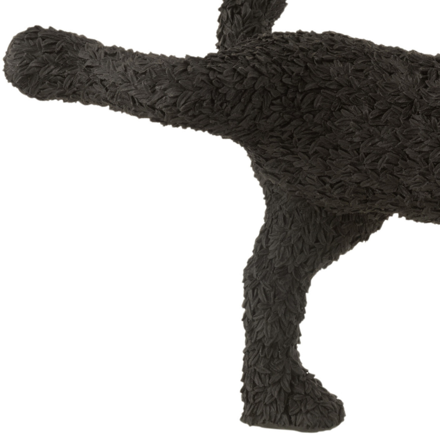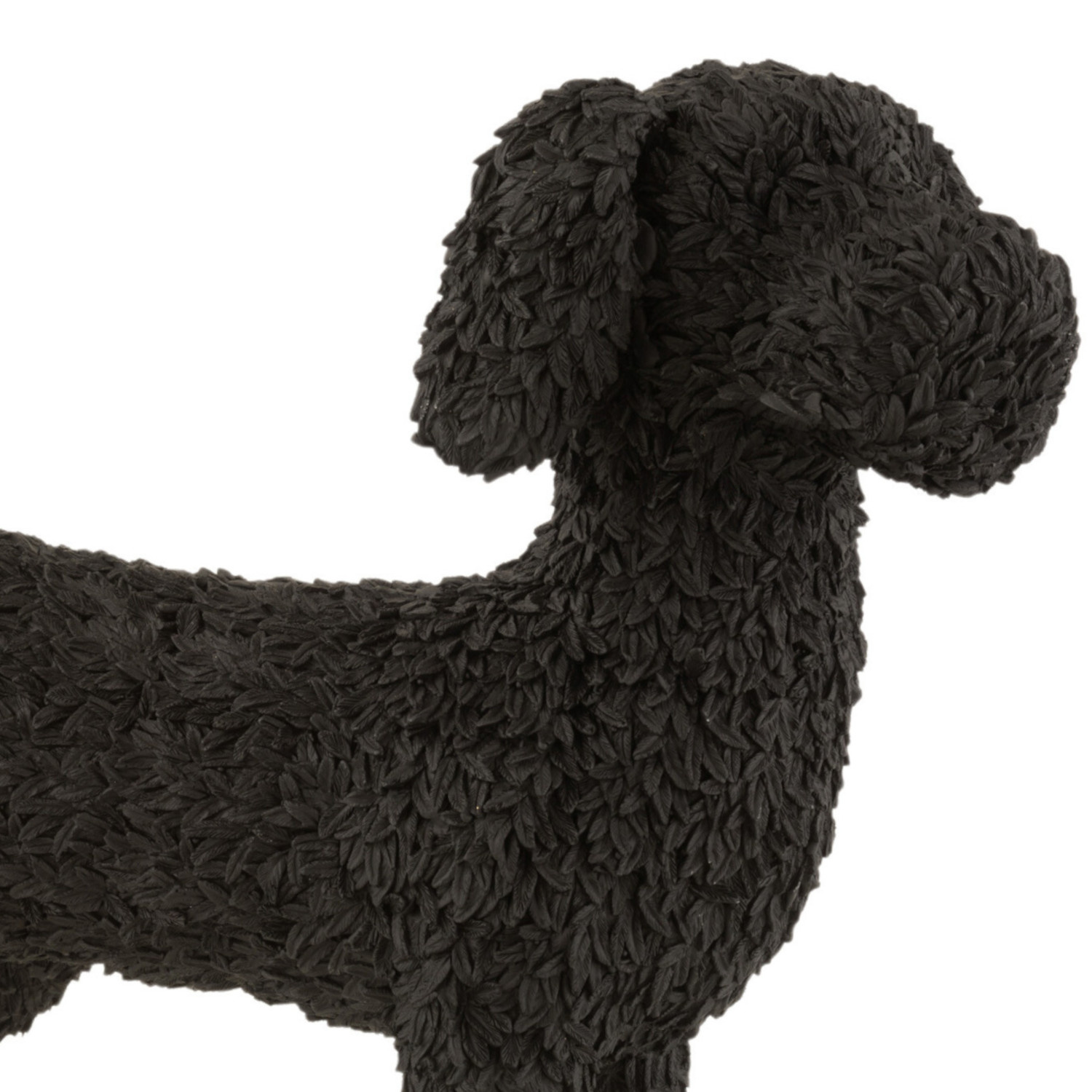 De hond is gemaakt van mat zwart polyresin en geheel uitgevoerd in een textuur van kleine veertjes of blaadjes. Het maakt van de hond een buitengewoon kunstzinnig object. Omdat door deze textuur je de vorm van de hond ziet, maar geen details zoals zijn neusgaten of ogen.