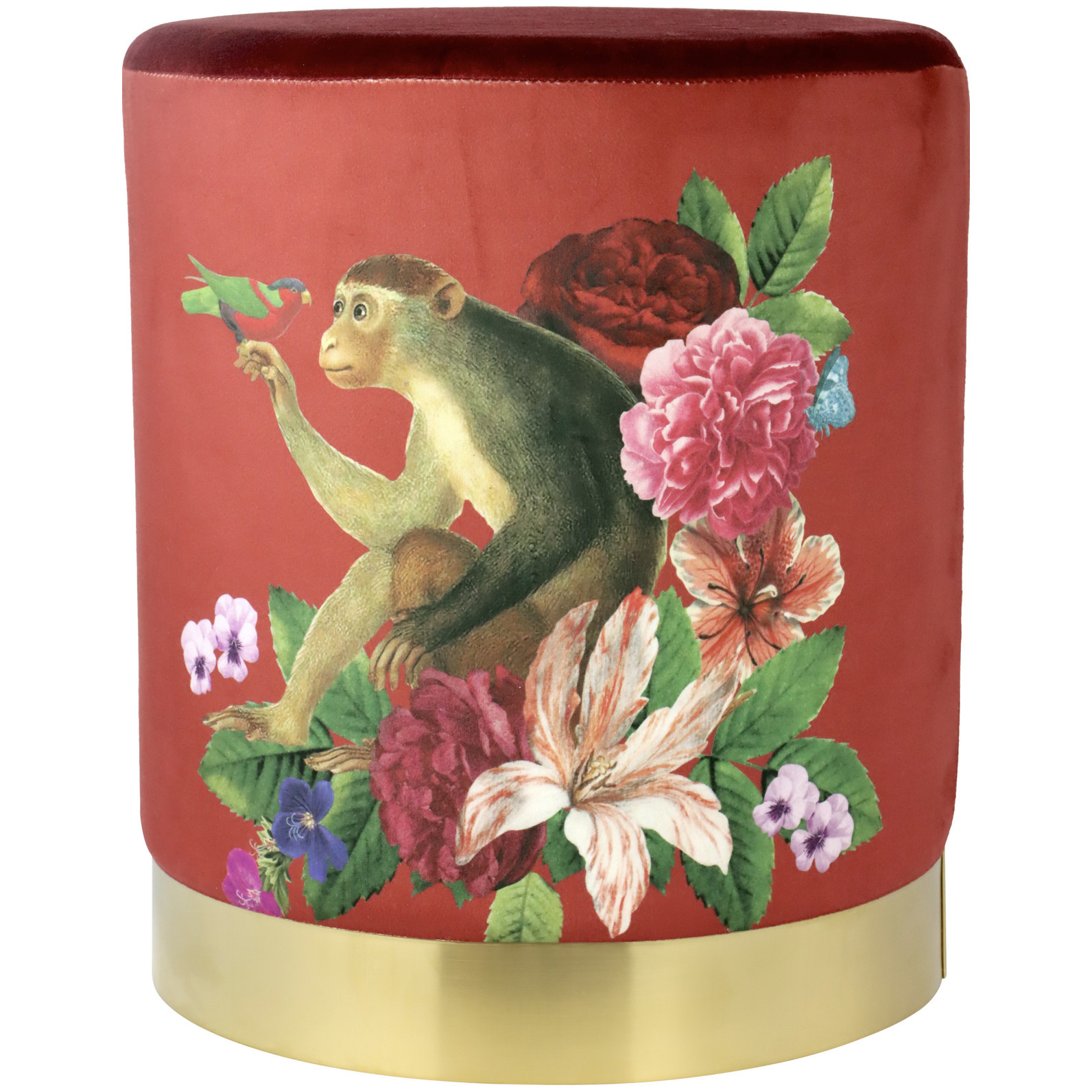 Functioneel en erg decoratief. Deze ronde poef gedecoreerd met een aap die een vogel op zich heeft rusten omringd door kleurrijke bloemen. Afgemaakt met een gouden onderkant. Die je kunt gebruiken als alternatieve zitplaats. Met zijn mooie kleuren past deze poef in iedere woonstijl!