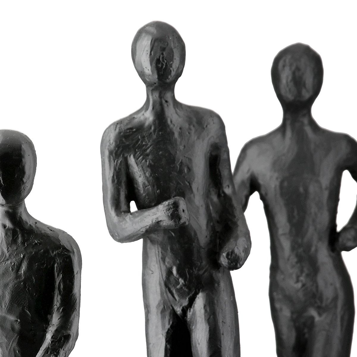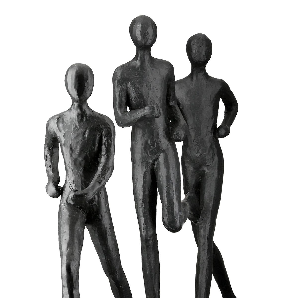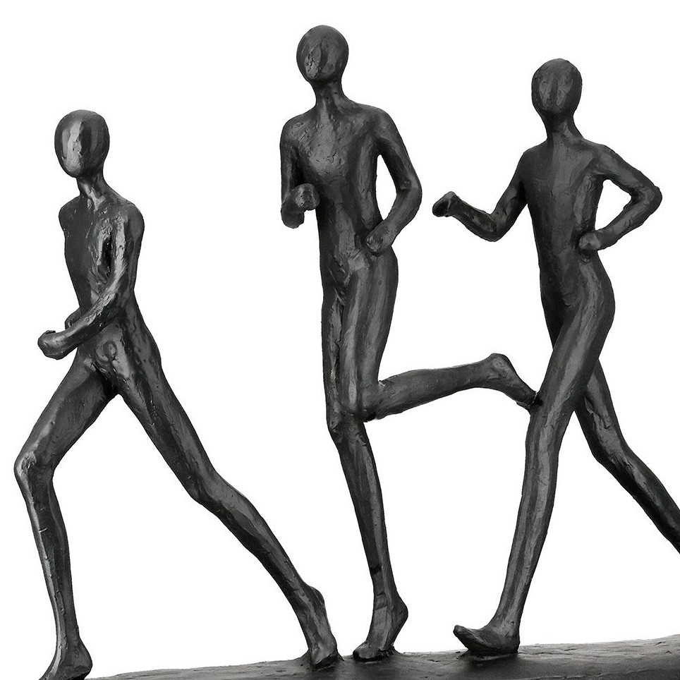 Fraai 'bewegingsbeeld' van drie hardlopende individuen. Een sculptuur uit de serie "Sport" van de Duitse firma Gilde. Aan de houding van de drie kun je zien dat ze een gestaag tempo lopen, maar zeker geen sprinters zijn. Dit zijn meer de langeafstandslopers. Zoals deelnemers aan de atletiek die de 3 km, 5 km en 10 km lopen. En zeker de marathonlopers komen tijdens hun 42,2 km zo voorbij. Dat wat betreft professionele sporters.