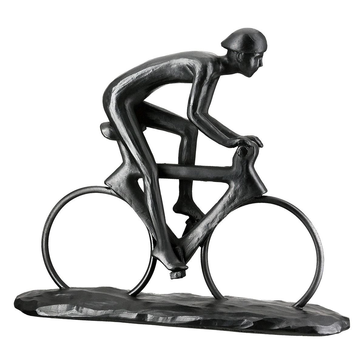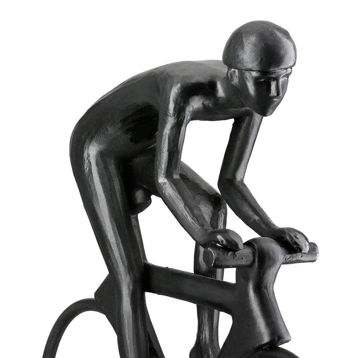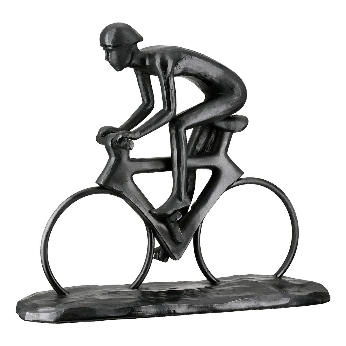 Stijlvol 'bewegingsbeeld' van een wielrenner die in een traditionele tijdrithouding op zijn fiets zit. Voorzien van gestroomlijnde helm en fiets voert hij een sportieve strijd tegen de klok. Volgens sommigen het ultieme onderdeel binnen de wielersport. Maar aan de uitrusting van deze renner te zien zou het best ook een baanwielrenner kunnen zijn! Ook zij zitten op prachtige gestroomlijnde fietsen voor zo min mogelijk luchtweerstand waardoor ze de hoogste snelheden op de baan kunnen bereiken.