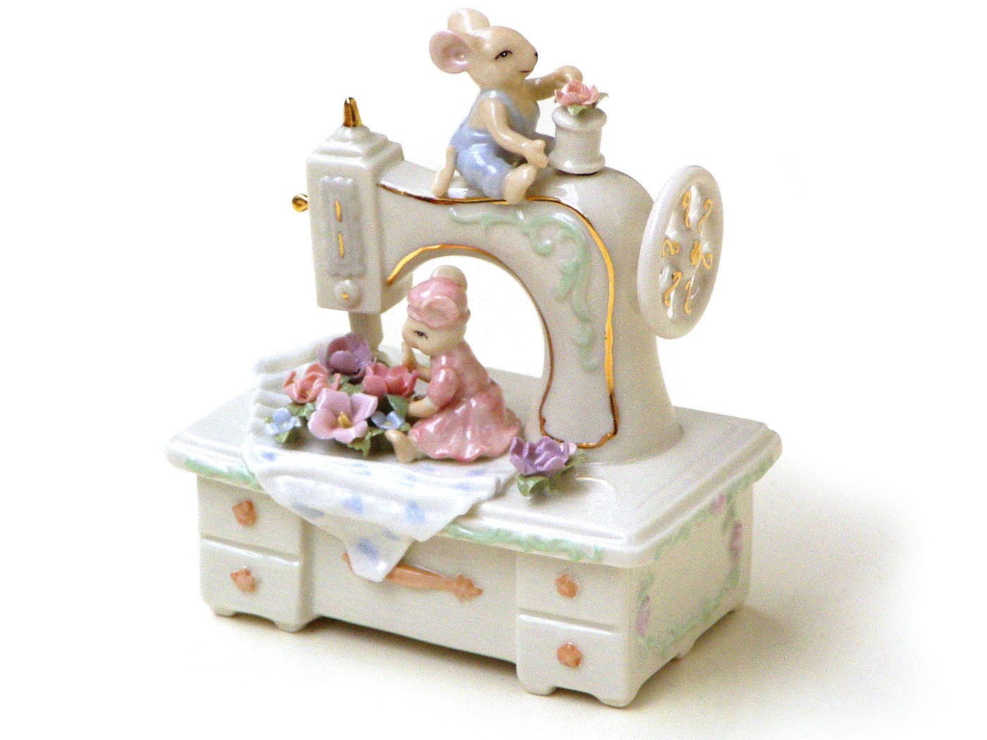 Muziekdoos als naaimachine met twee muizen. Uit de collectie Suberto Musicals van Cosmos Gifts. Prachtig gedetailleerd en volledig in porselein uitgevoerd. Het speelwerk is van metaal. Aan de onderzijde zit een vleugelmoer om het mechanisme mee op te winden. Na het opwinden klinkt de melodie en draait de spoel bovenop de naaimachine rond.