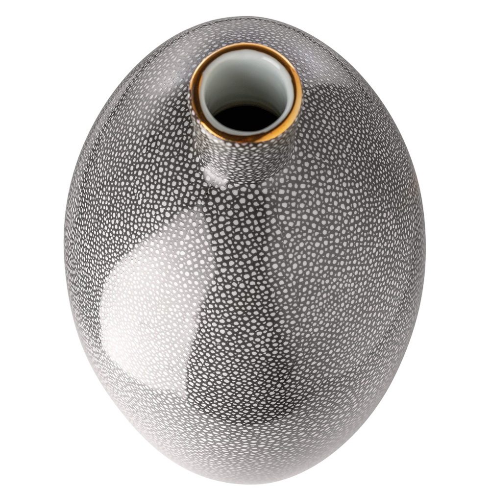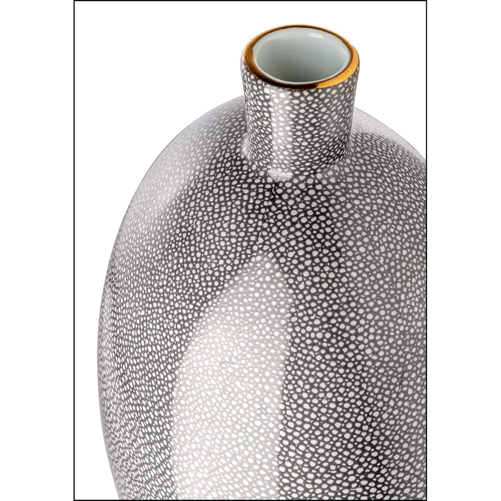 Grote porseleinen vaas uit de 'Athina' serie van het Duitse merk Gilde. Met een luxe uitstraling uitgevoerd in een donker grijs/crème kleur met artistiek stippatroon en contrastrijke gouden rand rond de opening van de hals. Door zijn net niet perfect ronde vorm een mooie decoratieve vaas voor op een eettafel, dressoir of in een grote kast. Door zijn grootte en vorm, in combinatie met zijn bolvormige broertje een prachtige set. Zelfs groot genoeg om ze samen in een hoek van de kamer op de grond te zetten.