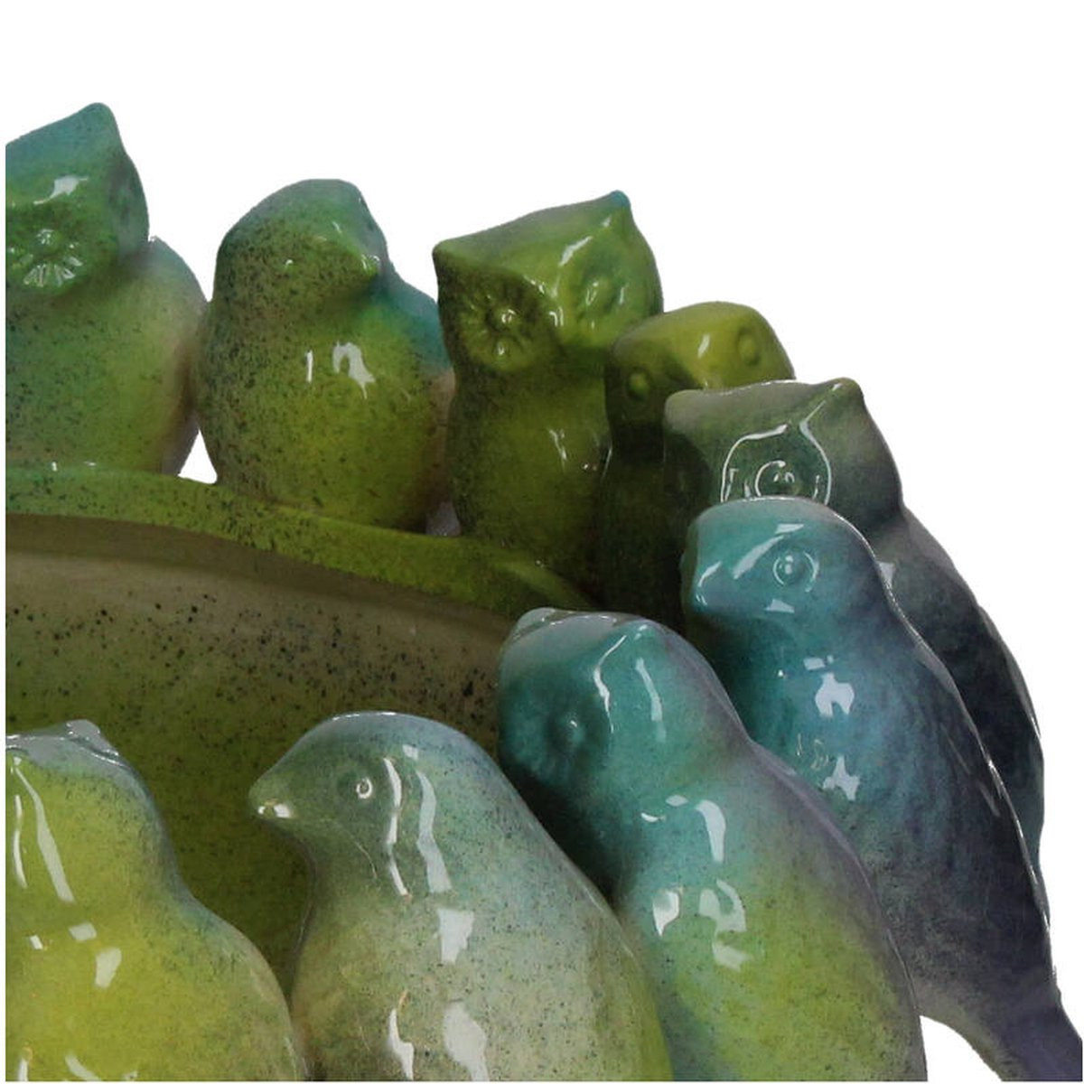 Zeker een mooie aandachttrekker voor op de eettafel of een mooi dressoir. Deze geglazuurde keramieken schaal is gedecoreerd met de mooiste vogels en uilen zittend op de rand. Met haar mooie groen en blauwe kleuren staat het erg mooi in een strak interieur maar ook in een kleurrijk interieur springt deze schaal eruit!