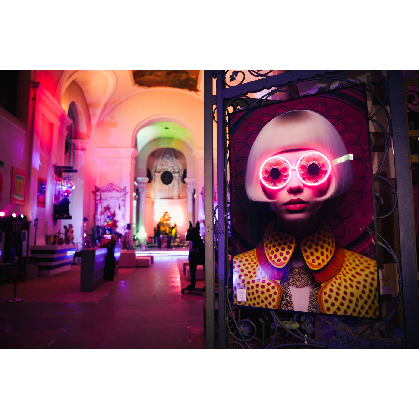 Een opvallend mooie glazen wanddecoratie met een zwart houten lijst. De afbeelding is van een blonde vrouw in kleurrijke kleding. Wat dit schilderij zo bijzonder maakt is haar grote ronde bril, dit is niet zomaar een bril, maar LED-verlichting. Hang het schilderij op aan de muur en zet de verlichting aan voor een bijzonder mooi effect!