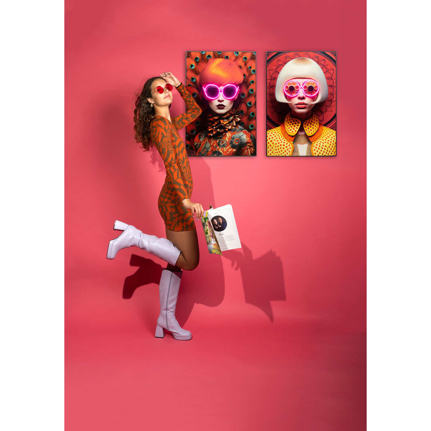 Een opvallend mooie glazen wanddecoratie met een zwart houten lijst. De afbeelding is van een blonde vrouw in kleurrijke kleding. Wat dit schilderij zo bijzonder maakt is haar grote ronde bril, dit is niet zomaar een bril, maar LED-verlichting. Hang het schilderij op aan de muur en zet de verlichting aan voor een bijzonder mooi effect!