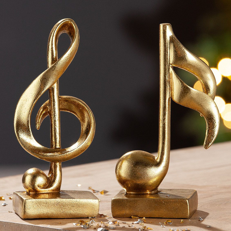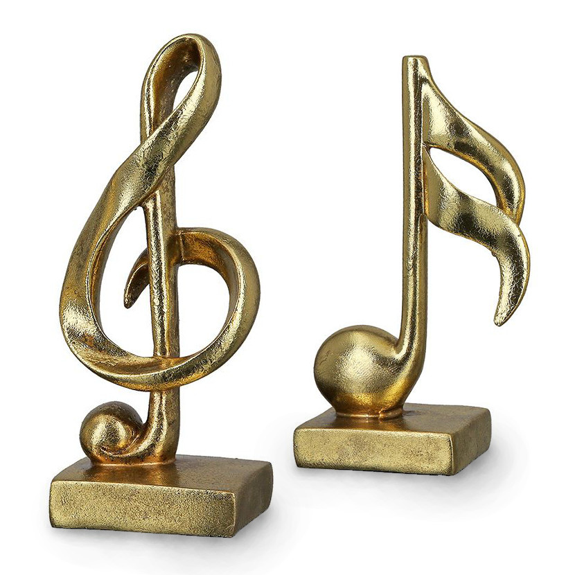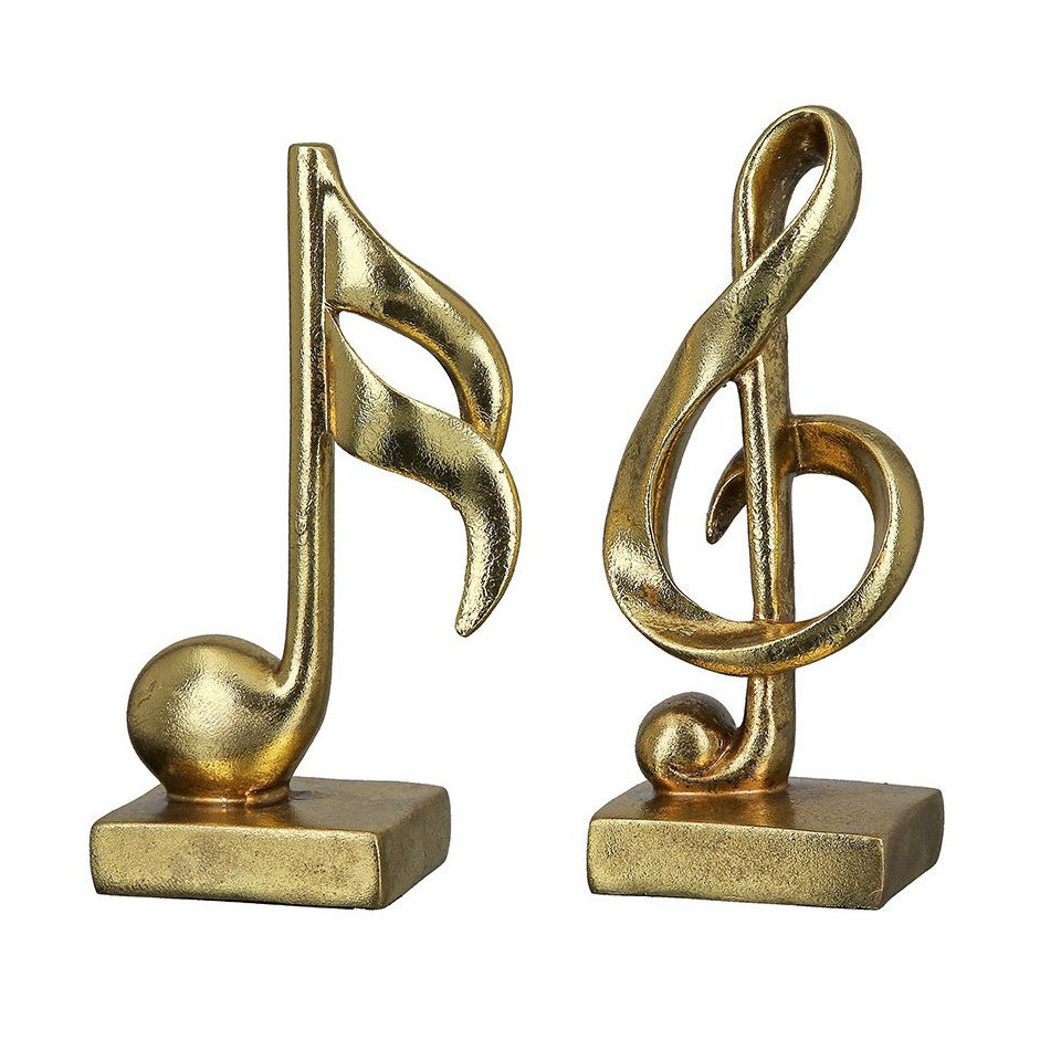 Moderne beelden set met twee elementen uit een notenbalk; de G-sleutel en een zestiende noot. Ofwel een muzieksleutel en een muzieknoot. Uitgevoerd in goud gekleurd polystone (kunsthars) en staand op een vierkant voetje. Het is natuurlijk de set voor iedere muziekliefhebber. Absoluut een aanrader!