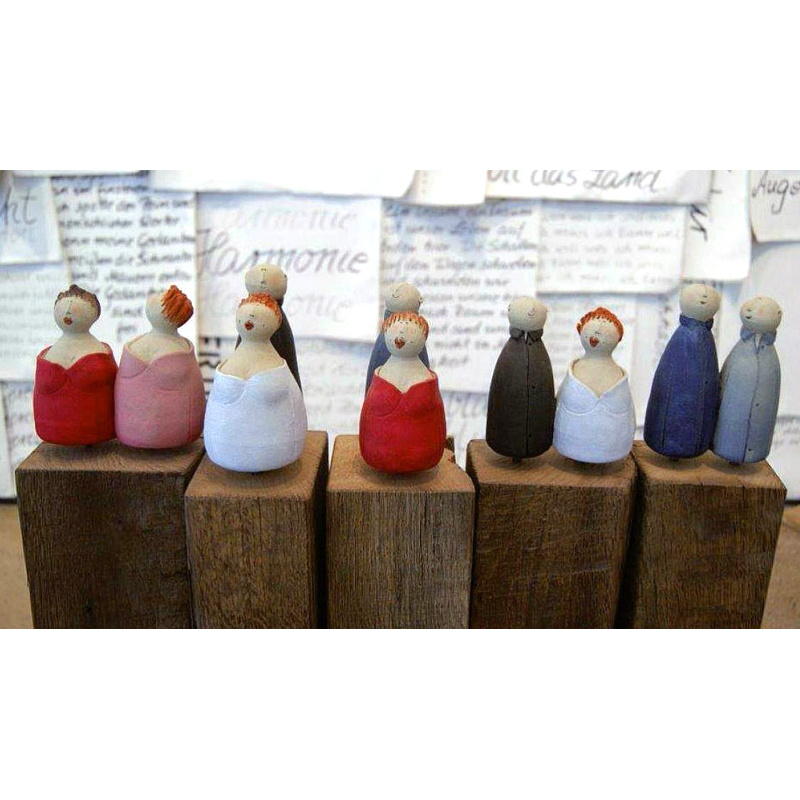 Serie beeldjes op ruwe stukken eikenhout. Het eikenhout is meer dan 200 jaar oud, plusminus 18 cm hoog en tussen de 10 - 15 cm. in doorsnede. Sommigen zijn vierkant anderen weer driehoekig maar de kunstenares zoekt altijd naar het best passende stuk hout bij een beeldje.