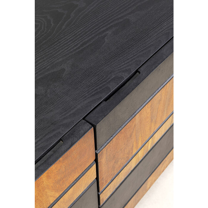 Met de handgemaakt mango houten dressoir met natuurtinten en zwart gelakte delen. Opbergruimte achter 3 deurtjes met het Soft Close systeem.Tijdloos meubelstuk wat op veel plaatsen tot zijn recht kan komen, ook te gebruiken als televisiekast.