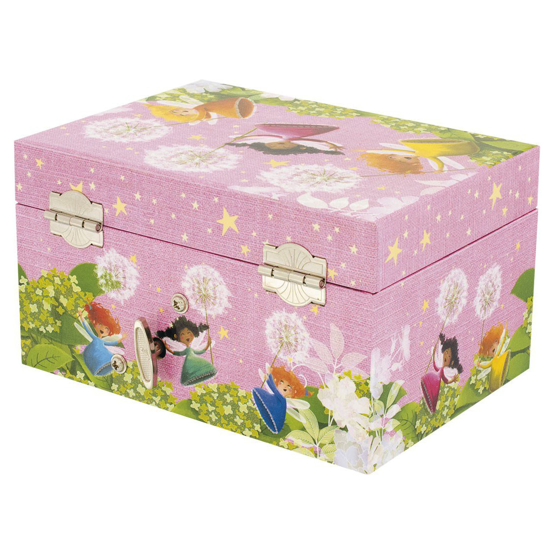 Speeldoos als opbergdoos gedecoreerd met een vrolijke afbeelding van 3 feetjes die hangend aan de pluisjesbollen van paardenbloemen door de lucht zweven. De ondergrond van de doos heeft een roze canvas textuur waarop de kleurrijke afbeeldingen zijn geplaatst.