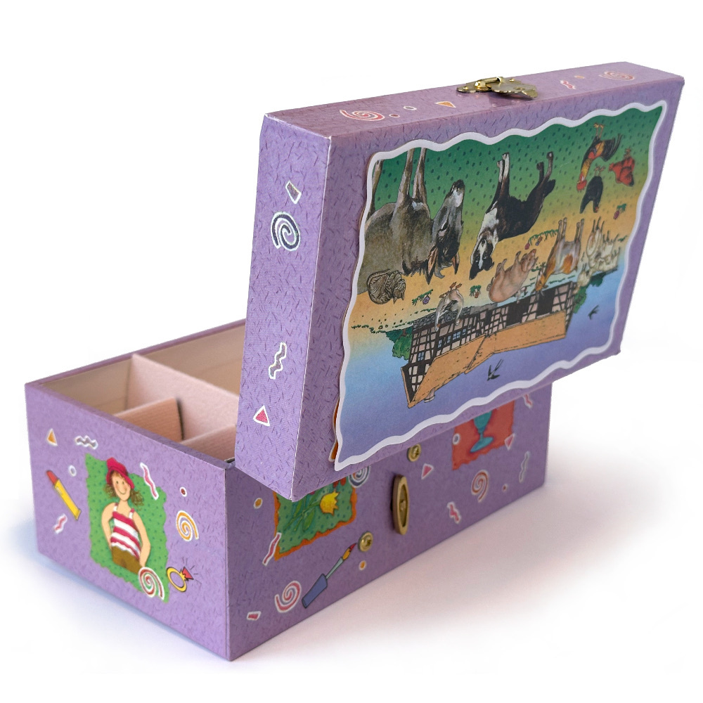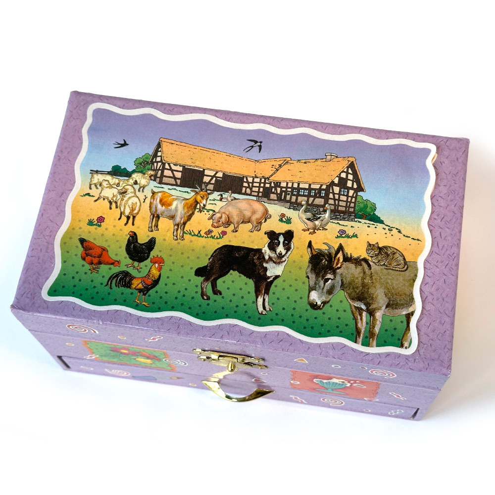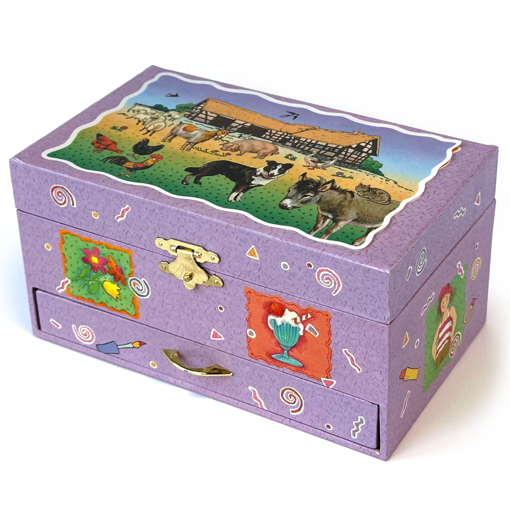 Deze grote doos is voorzien van een levendige afbeelding waarop verschillende dieren staan die je bij een boerderij kunt aantreffen. De doos, met als basiskleur paars, is verder vrolijk gedecoreerd met leuke kleine ornamenten. Daarnaast zijn er kleine tekeningen van o.a. bloemen, vrolijke kinderen en een ijscoupe.