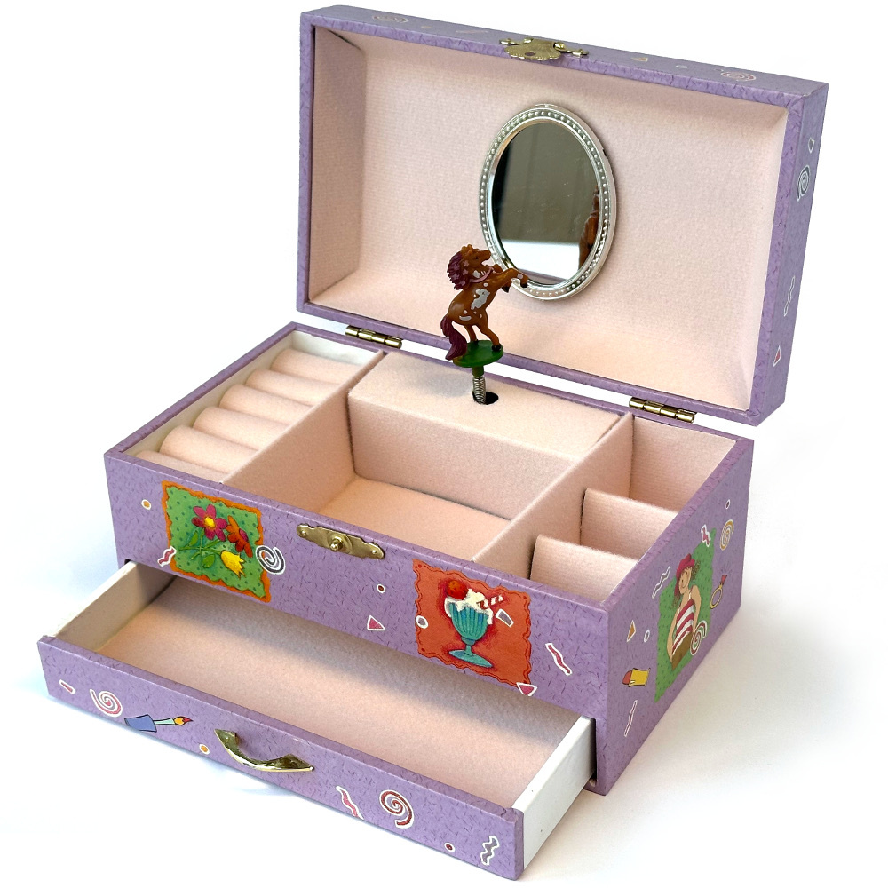 Speeldoos als opbergdoos voor kleine spulletjes zoals bijvoorbeeld sieraden. Hiervoor heeft de doos vakverdeling met een speciaal gedeelte voor ringen. Tevens is de doos voorzien van een grote lade.