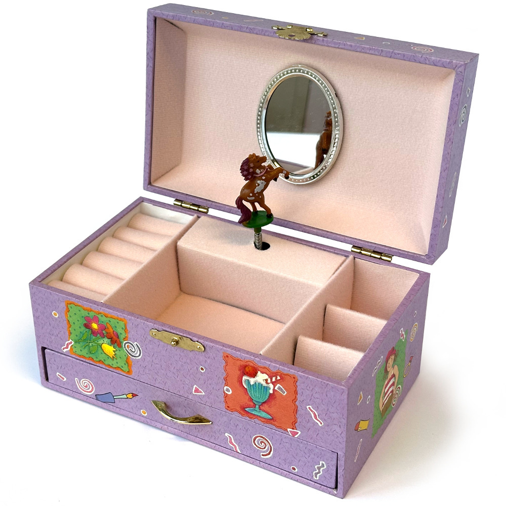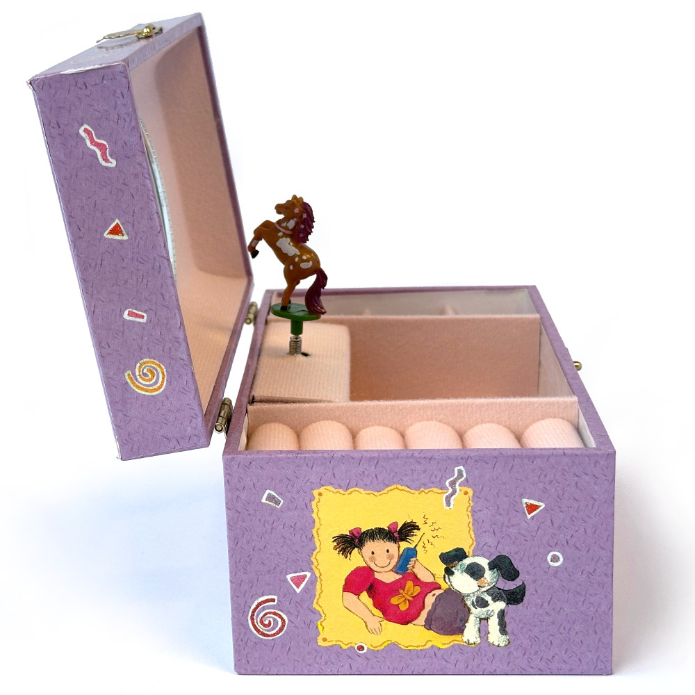 De gehele binnenzijde is afgewerkt met een zachte roze stof. Het deksel is voorzien van een klein ovaal spiegeltje. Daarvoor staat een steigerend bruin paard. Aan de achterzijde van de doos zit een vleugelmoer om het mechanisme mee op te winden. Na het openen van het deksel begint de melodie te spelen en draait het kleine bruine paard rond.