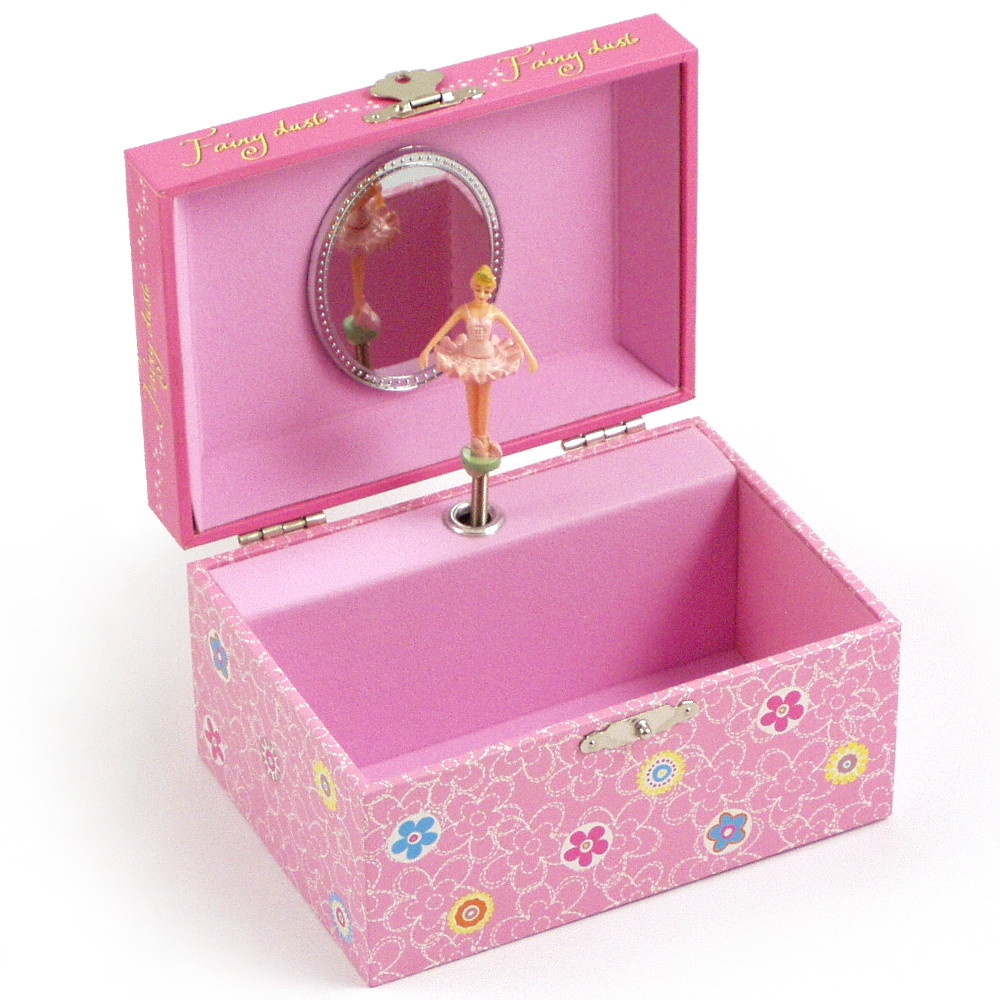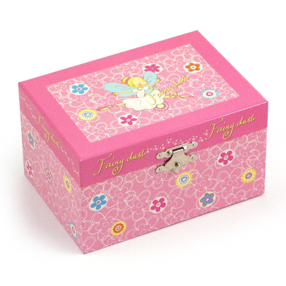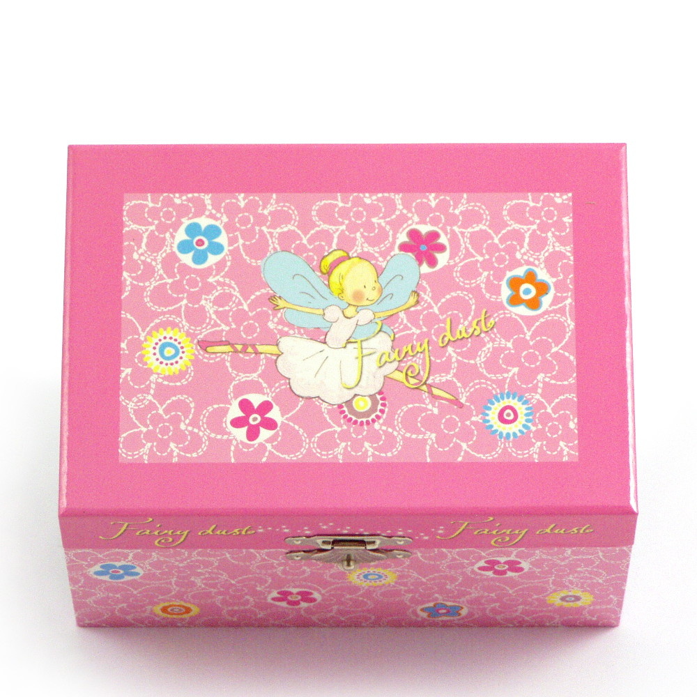 Ook de binnenzijde van de doos heeft als basiskleur roze. Die is voor een groot deel afgewerkt met een zachte roze stof. Verder zit er in het deksel een ovaal spiegeltje. Aan de achterzijde van de doos zit een vleugelmoer om het mechanisme mee op te winden. Na het openen van het deksel begint de melodie te spelen en verschijnt er een kleine roze fee die ronddraait.