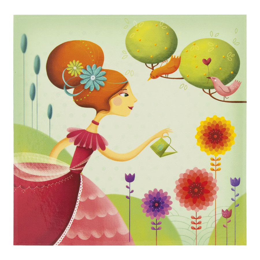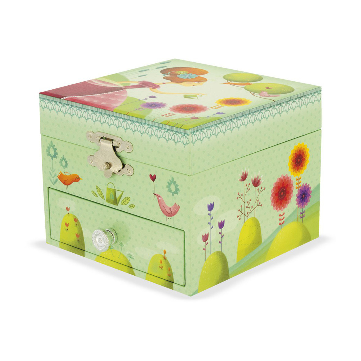 Deze doos komt uit een serie van het merk Ulysse die zijn gedecoreerd door de bekende Franse illustratrice en schrijver van kinderboeken Leïla Brient. Dit vierkante model is voorzien van een afbeelding met een deftig gekleed meisje dat met een kleine gieter haar bloemen in de tuin water geeft. Twee vogeltjes die vanuit een boom zitten te kijken zingen haar toe. De rest van de doos is gedecoreerd met passende illustraties.