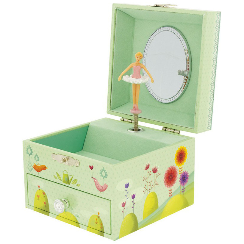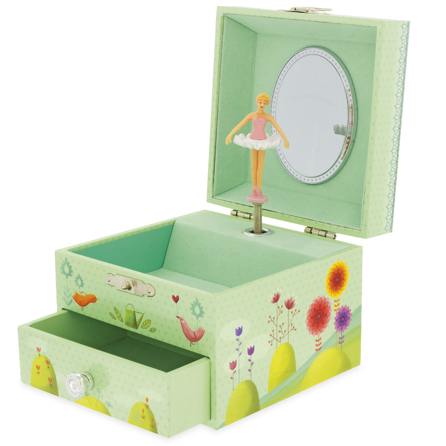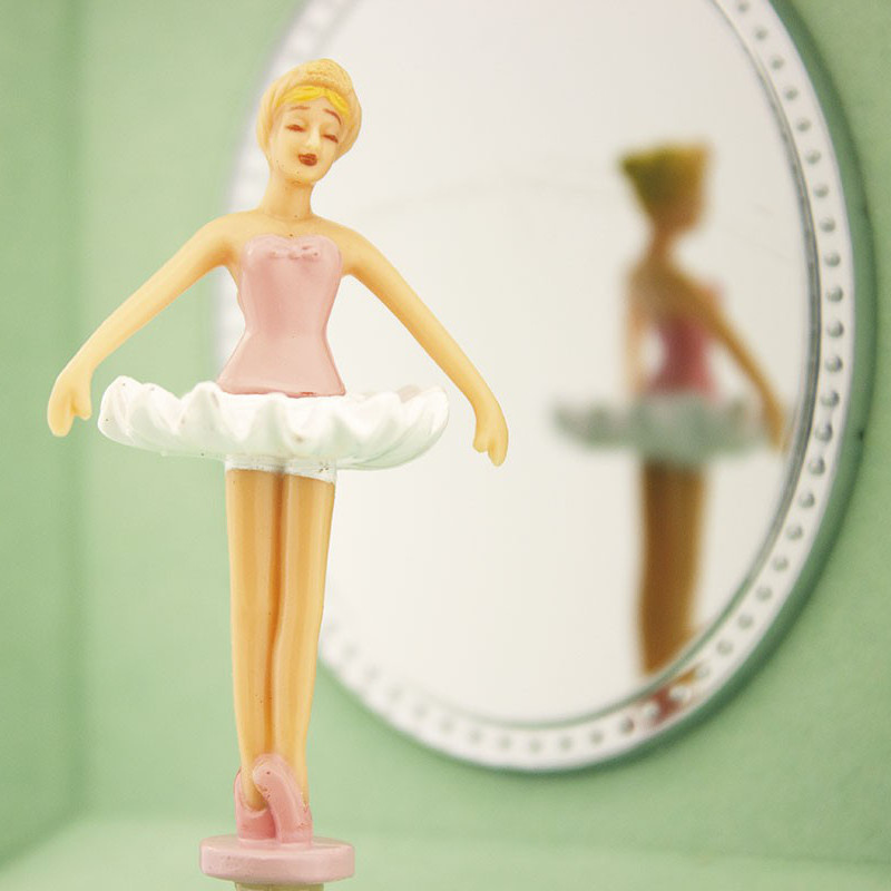 De basiskleur van de doos is lichtgroen. De gehele binnenzijde is afgewerkt met een zachte stof in turquoise. Het deksel is voorzien van een klein ovaal spiegeltje. Aan de achterzijde van de doos zit een vleugelmoer om het mechanisme mee op te winden. Na het openen van het deksel begint de melodie te spelen en verschijnt er een kleine ballerina in roze/wit die ronddraait.