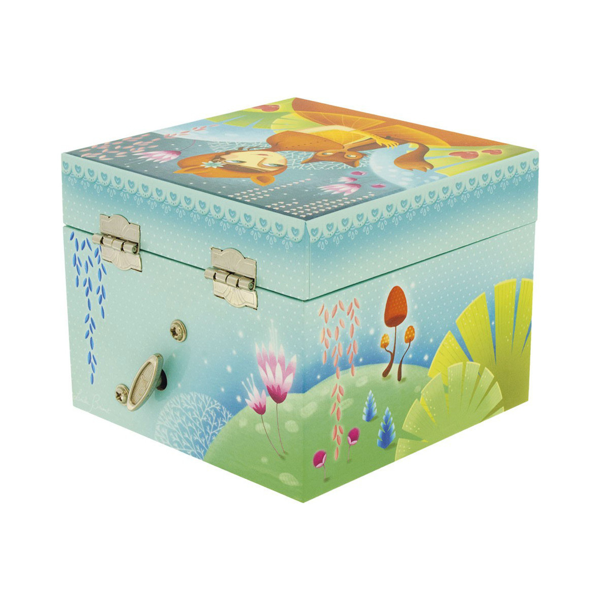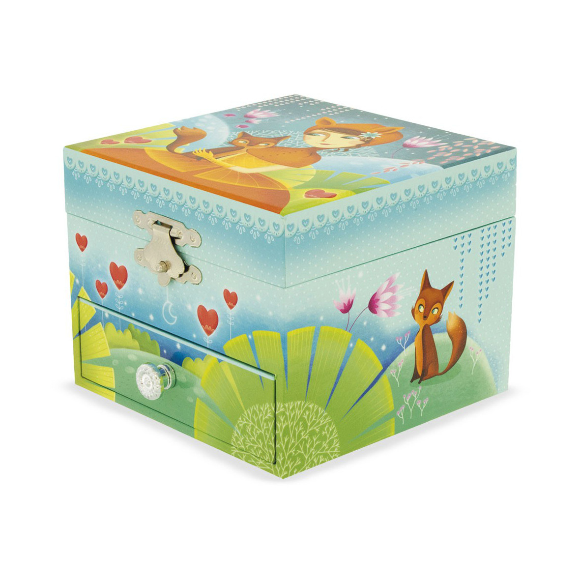 Deze doos komt uit een serie van het merk Ulysse die zijn gedecoreerd door de bekende Franse illustratrice en schrijver van kinderboeken Leïla Brient. Dit vierkante model is voorzien van een afbeelding met een klassiek gekleed meisje die een vos bij zich heeft. Het meisje is warm aangekleed met o.a. een bruine vossenmuts. De vos kijkt haar aan en denkt er het zijne van. De rest van de doos is gedecoreerd met passende illustraties.