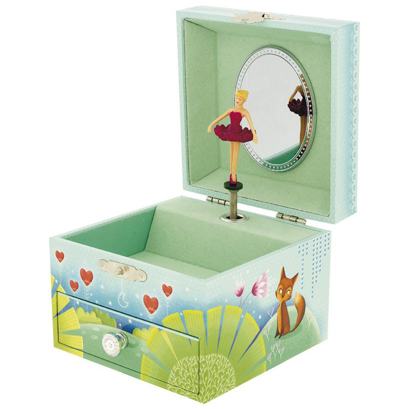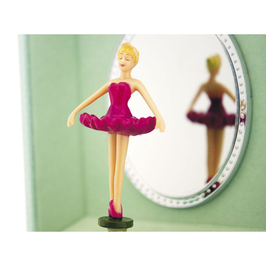 De doos is uitgevoerd in lichtblauw met groen. De gehele binnenzijde is afgewerkt met een zachte stof in lichtgroen. Het deksel is voorzien van een klein ovaal spiegeltje. Aan de achterzijde van de doos zit een vleugelmoer om het mechanisme mee op te winden. Na het openen van het deksel begint de melodie te spelen en verschijnt er een kleine ballerina in rood die ronddraait.