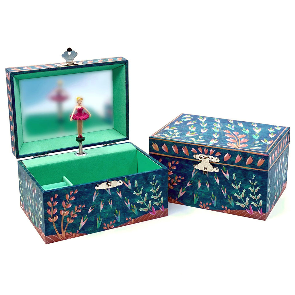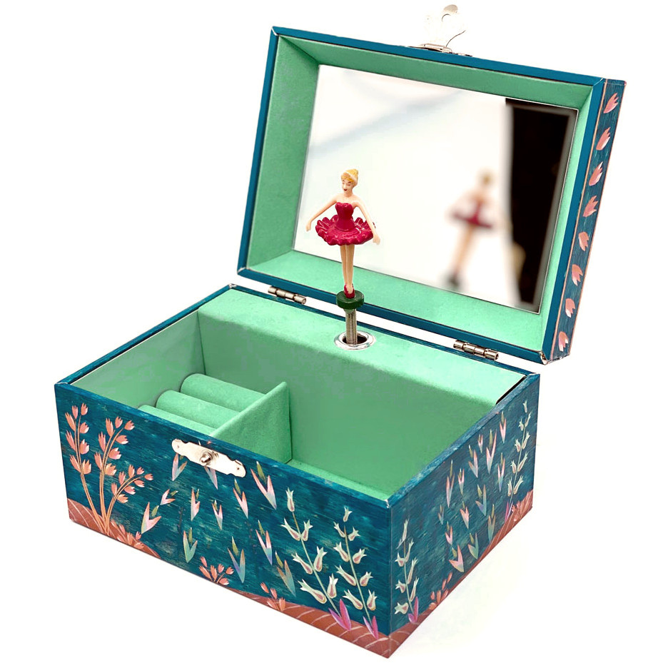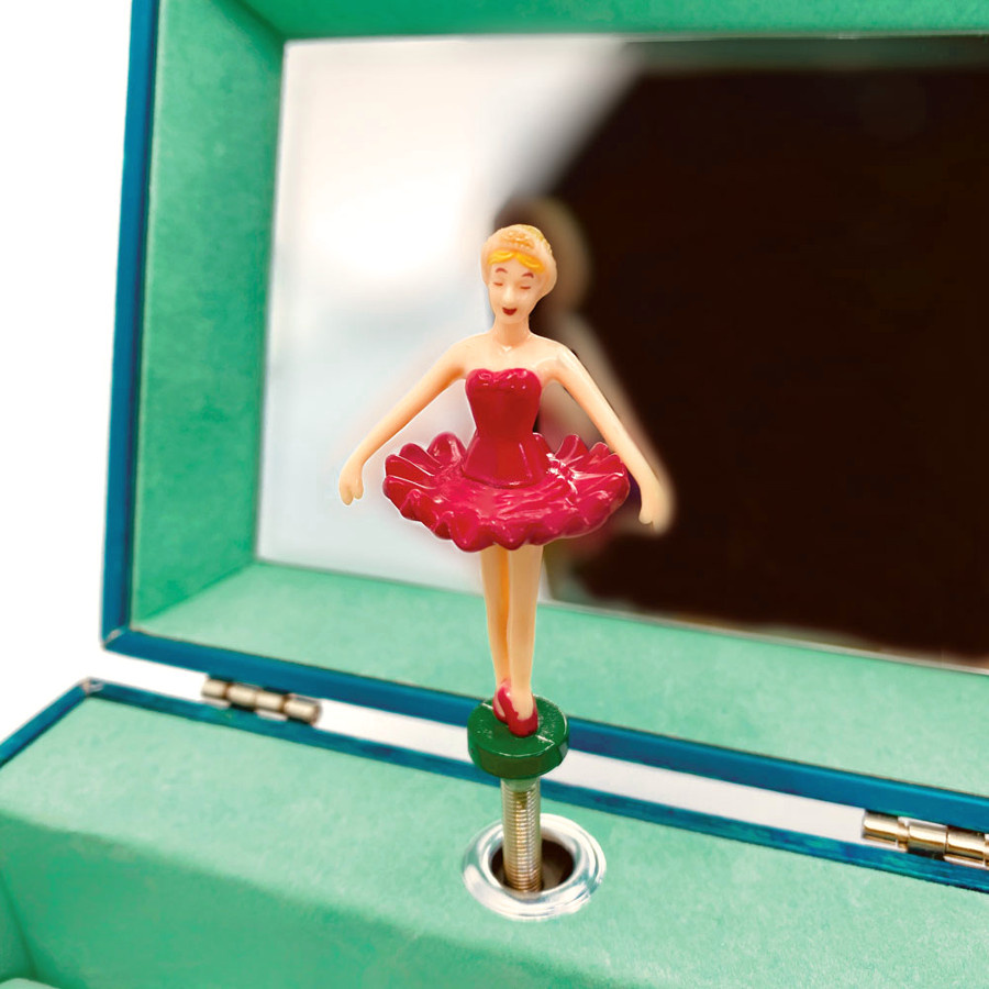 De gehele binnenzijde van de doos is afgewerkt met een zachte stof in zeegroen. De doos is verdeeld in twee delen. Een grote open ruimte en een klein deel speciaal voor ringen of om andere zaken tussen te steken. In het deksel zit over de gehele breedte een grote spiegel. Aan de achterzijde van de doos zit een vleugelmoer om het mechanisme mee op te winden. Na het openen van het deksel begint de melodie te spelen en verschijnt er een kleine ballerina in rood die ronddraait.