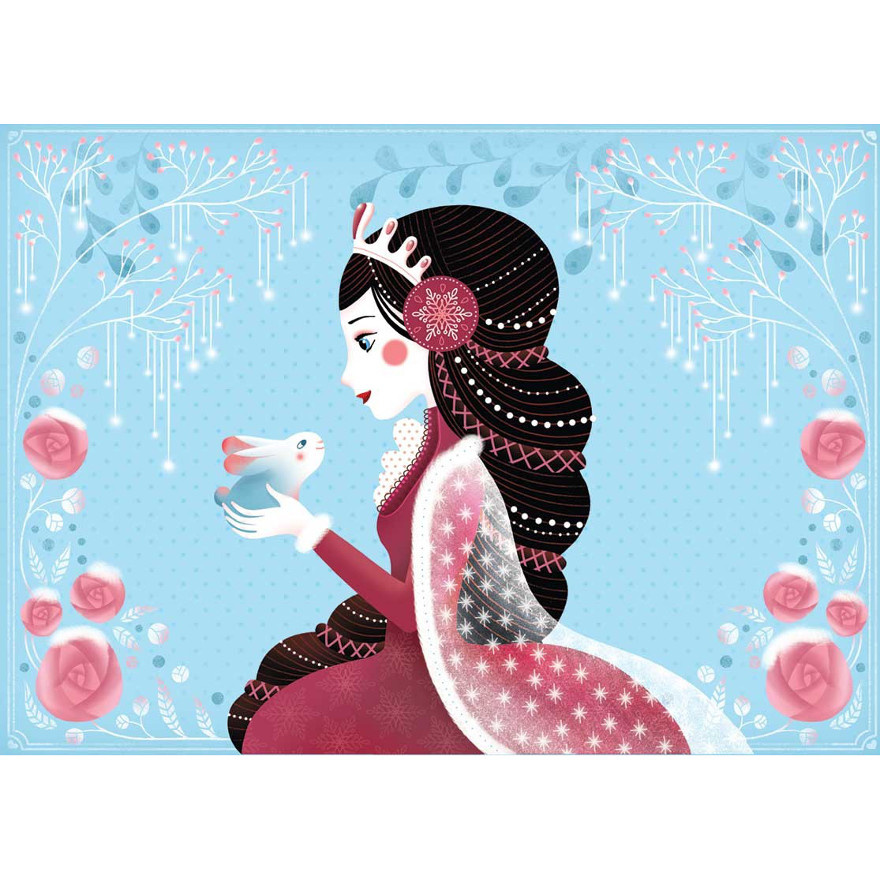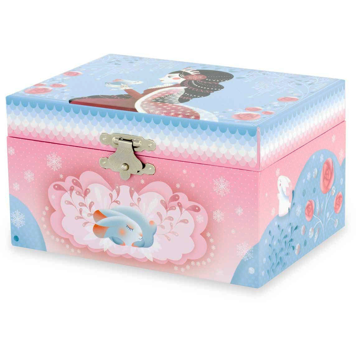 Deze doos is gedecoreerd met een prachtige prinses. Ze heeft lang donker haar ingevlochten met kralen en linten. Ze is gekleed in een donkerrode jurk met kant en draagt een diadeem. In haar handen heeft ze een klein konijntje, haar favoriete huisdier. Ze houdt onwijs veel van konijnen vandaar dat je ze op elke zijde van de doos tegenkomt in wit en grijs.