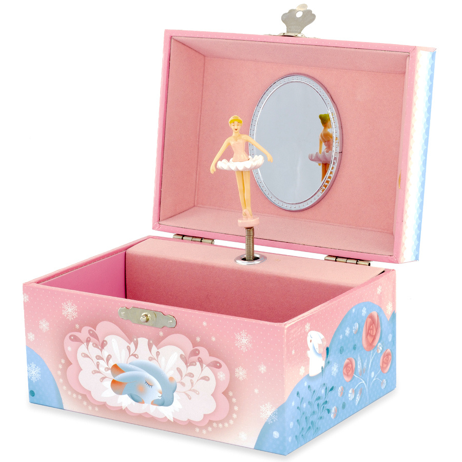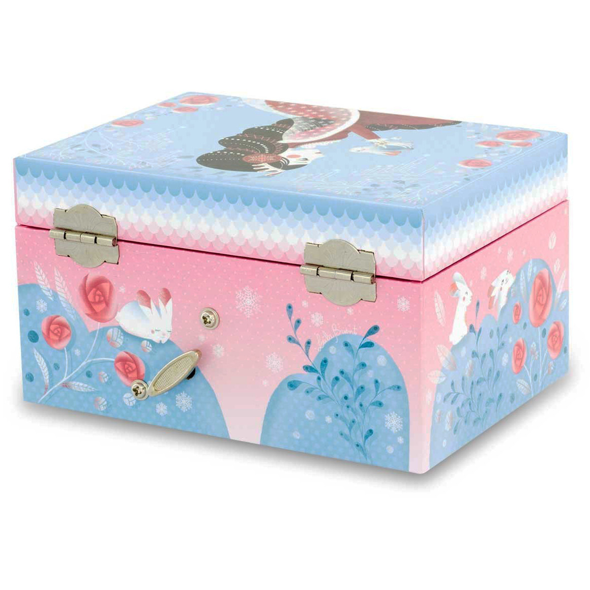 De basiskleuren van de doos zijn lichtblauw en lichtroze met wit. De gehele binnenzijde is afgewerkt met een zachte roze stof. Het deksel is voorzien van een klein ovaal spiegeltje. Aan de achterzijde van de doos zit een vleugelmoer om het mechanisme mee op te winden. Na het openen van het deksel begint de melodie te spelen en verschijnt er een kleine ballerina in roze/wit die ronddraait.