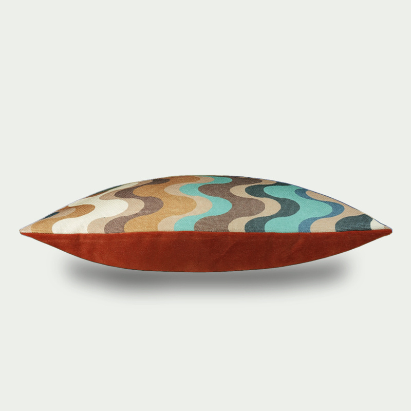 Decoratief sierkussen met een golvend jaren 70 motief in verschillende tinten blauw, bruin en crème. Met een achterzijde van in Nederland geweven velours. Dit kussen is goed te combineren met andere kleurrijke kussens. Je bank of stoel ondergaat een ware metamorfose wanneer je dit kussen erin legt. Een eyecatcher die je bank of stoel transformeert en aankleedt!