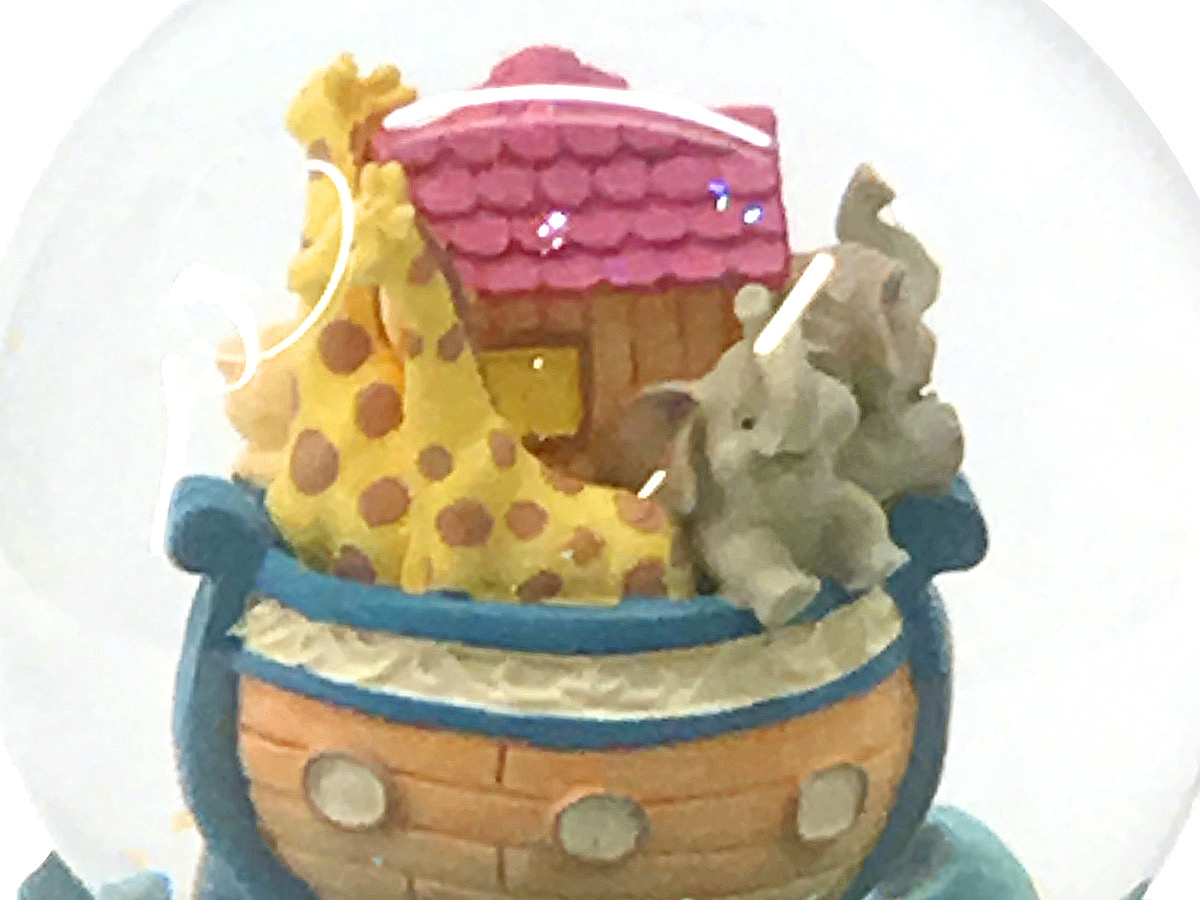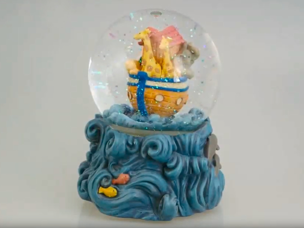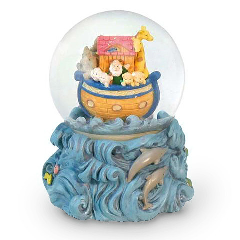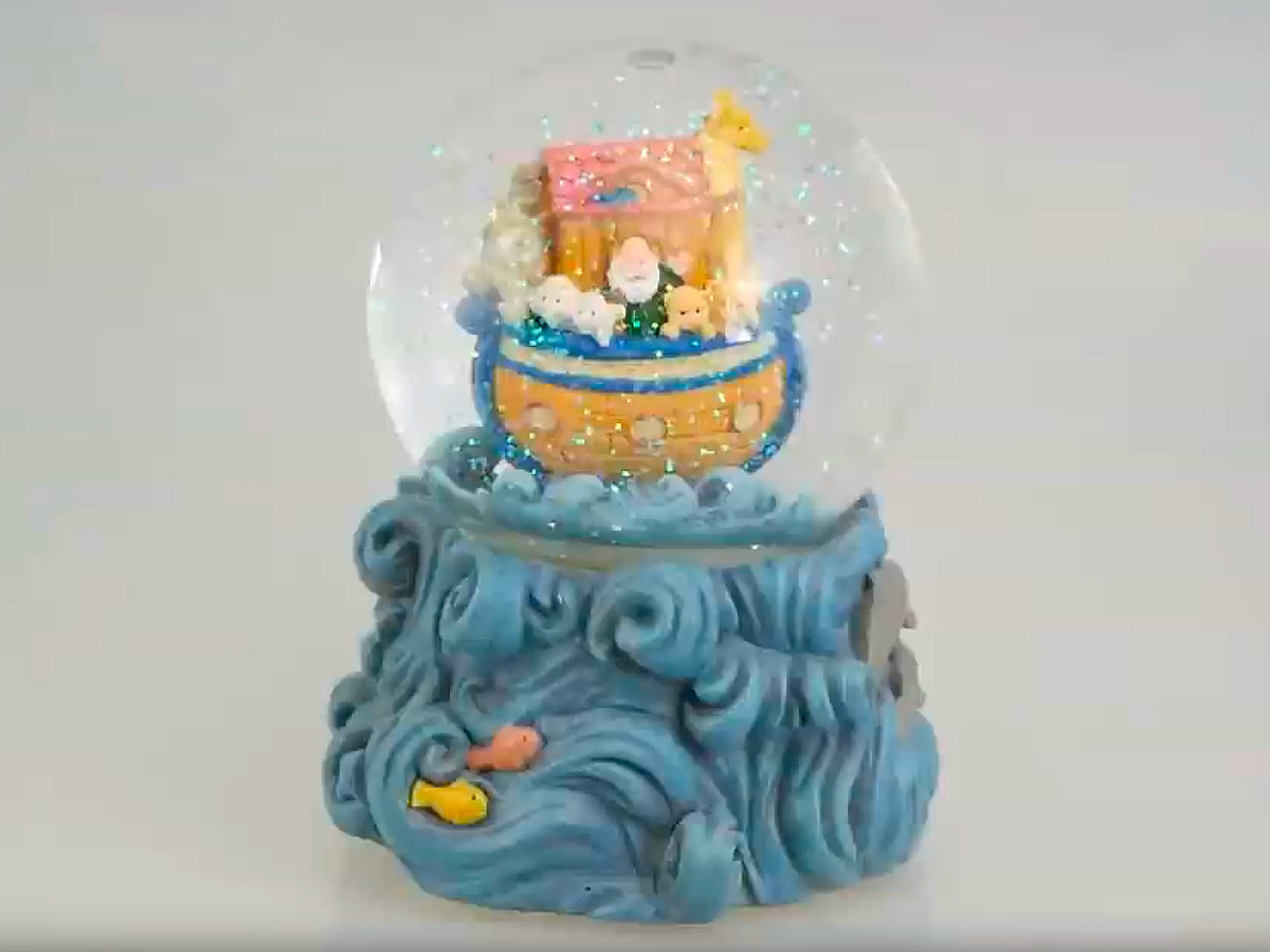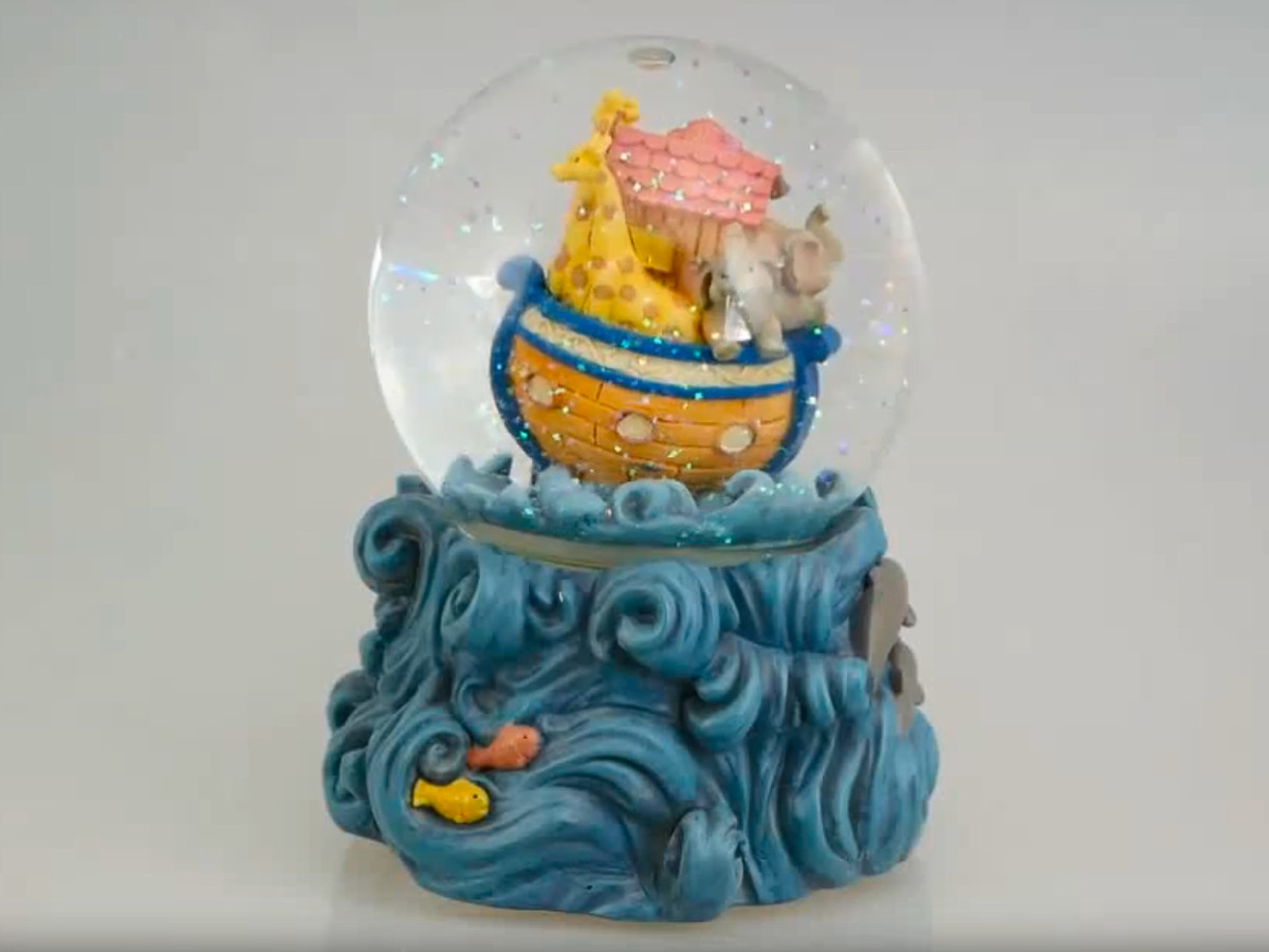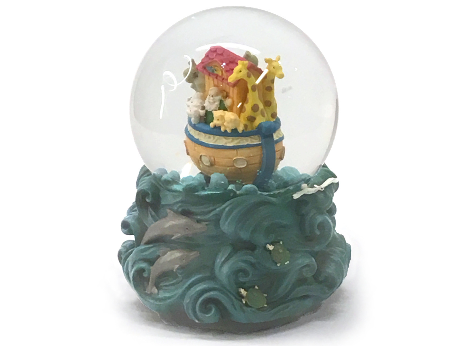 Muziekdoos met een glazen waterbol waarin de Ark van Noah danst op de golven. Op de Ark zien we Noah staan samen met een aantal verschillende dieren. Zoals een paartje giraffen, olifanten en tijgers. Ook in en op het water, aan de voet van de sneeuwbol, zijn enkele dieren te zien waaronder een paartje dolfijnen.