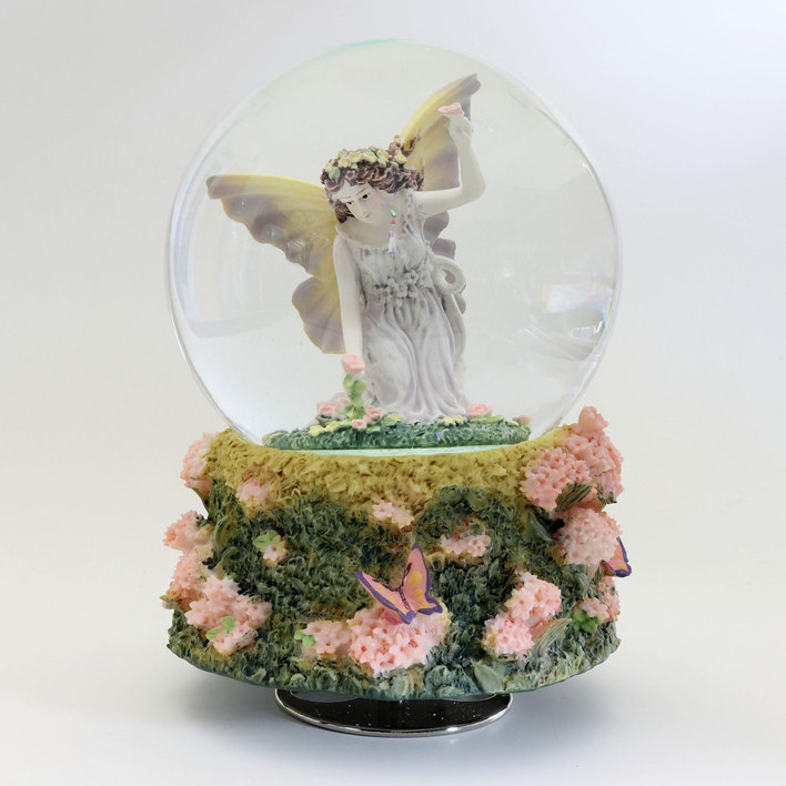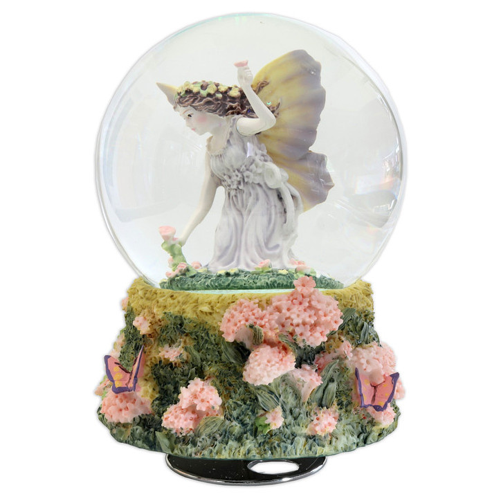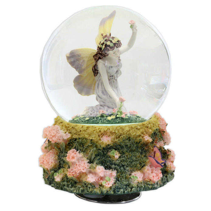 Muziekdoos met elf in een glazen waterbol, waarin het glitters sneeuwt als je er mee schudt. De elf zit geknield in een veld met bloemen om er enkele te plukken. Het lijken rozen te zijn. De voet van de sneeuwbol daarentegen is gedecoreerd met Spaanse Hyacinten, waar her en der vlinders op zitten.