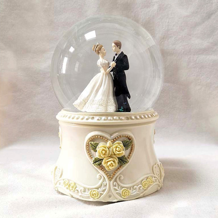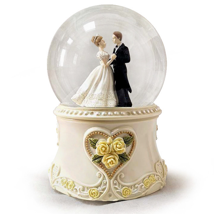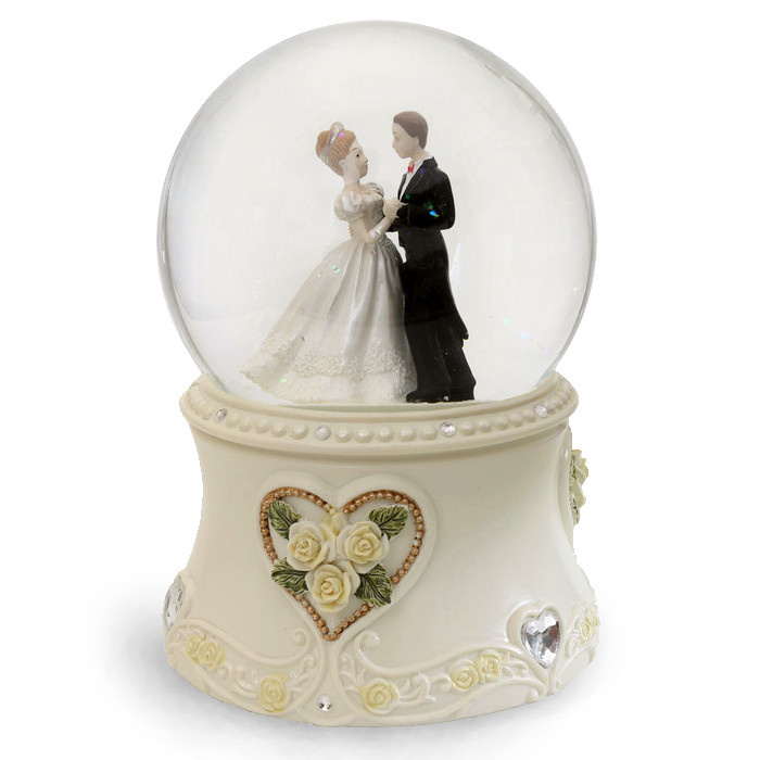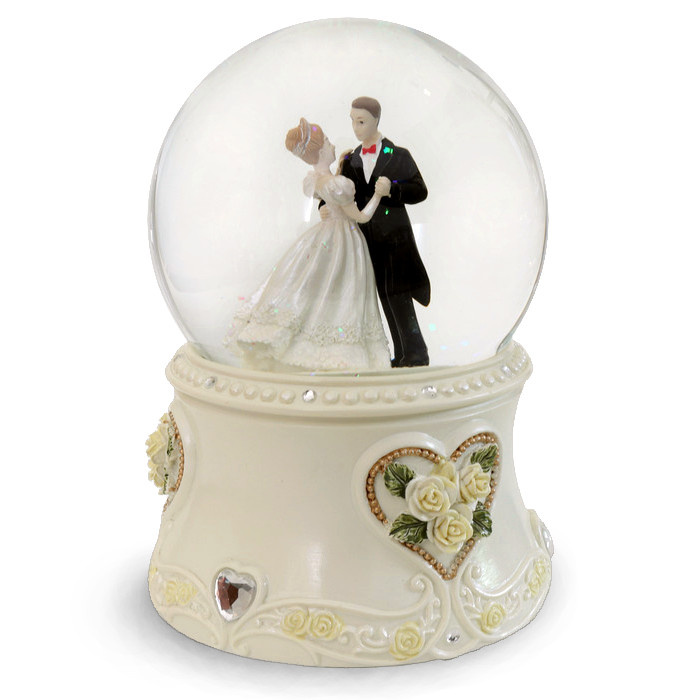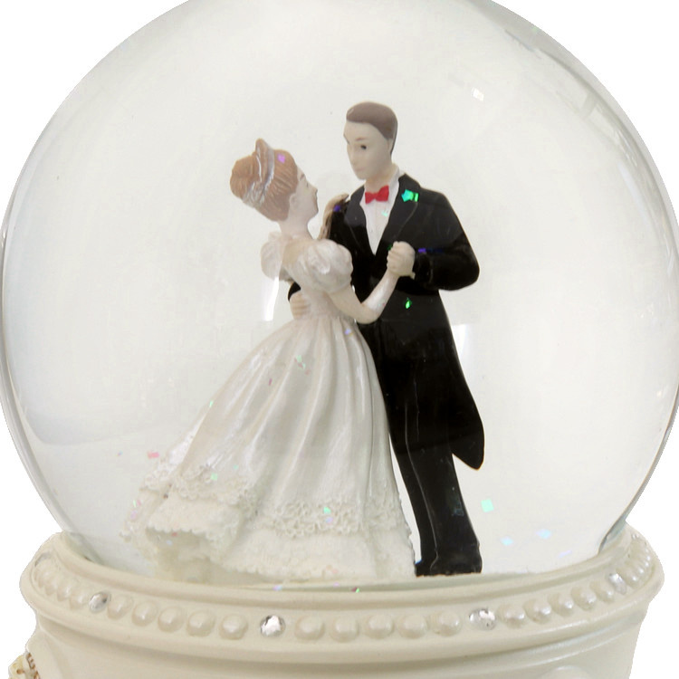 Speeldoos met een glazen waterbol waarin een dansend huwelijkspaar is te zien en waarin het glitters sneeuwt als je er mee schudt. Dit pas getrouwde stel is traditioneel gekleed. Hij in jacquet en zij in een lange witte jurk. We zien het kersverse bruidspaar hier tijdens de openingsdans voor hun bruiloftsfeest.
