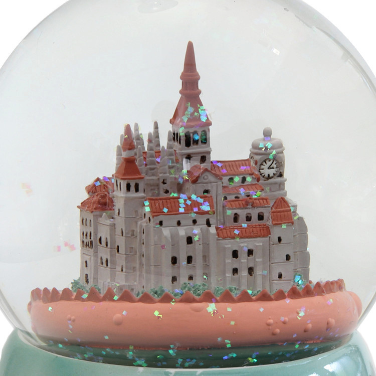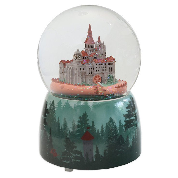 Deze sneeuwbol is gedetailleerd en passend gekleurd uitgevoerd. De voet is rondom geïllustreerd met een afbeelding van een groot donker bos in de schemer, waarbij de contouren van bomen en delen van het kasteel nog zichtbaar zijn.