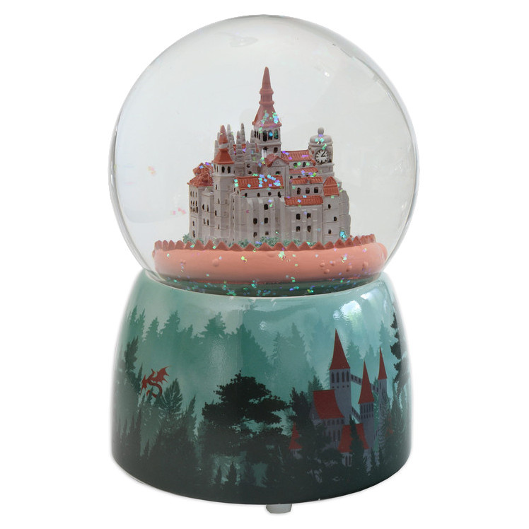 Speeldoos met een kasteel en een slapende draak in een glazen waterbol, waarin het glitters sneeuwt als je er mee schudt. Te zien is een prachtig gedetailleerd kasteel waar omheen een lange roze/rode draak ligt te slapen. Een voorstelling die we kennen uit verschillende mythen en legenden. Zoals uit "De legende van de Draak van Wawel", over het ontstaan van de Poolse stad Krakau. Of van "Het Drakenhol" (La Tanière du Dragon) uit Disneyland Parijs over de slapende draak in de diepste gewelven onder het betoverende kasteel van Doornroosje. En uit het prentenboek "Ssst, de draak slaapt!" van Bianca Schulze en Samara Hardy.