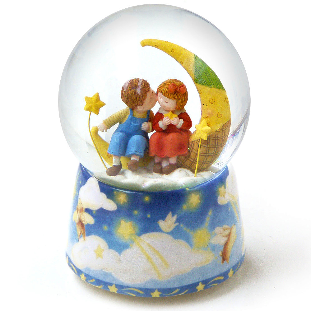 Muziekdoos met een glazen waterbol waarin twee kinderen zitten en waarin het glitters sneeuwt als je er mee schudt. In de glitterbol zitten twee kinderen tussen de wolken op een halve maan. De jongen verzameld al zijn moed en geeft het meisje een zoen op haar wang, waar zij enigszins verlegen van wordt. De voet van deze sneeuwbol is rondom voorzien van een afbeelding met kleine knuffels die door de wolken aan de sterrenhemel vliegen. Na het opwinden van het mechanisme, met de vleugelmoer aan de onderzijde, klinkt de melodie en draait de voorstelling in de bol rond.
