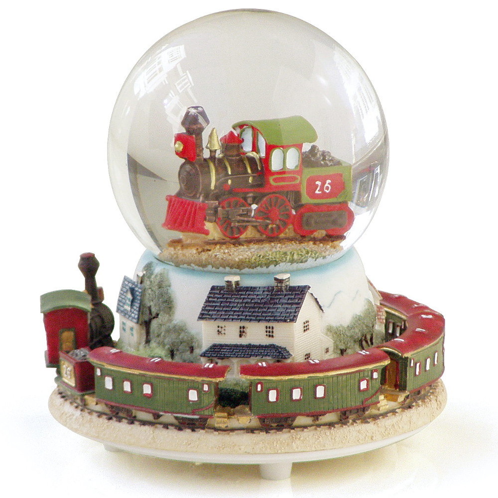 Muziekdoos met een ouderwetse locomotief in glazen waterbol, waarin het glitters sneeuwt als je er mee schudt. Naast de trein staat de conducteur klaar om op zijn fluit te blazen zodat de trein kan vertrekken. De voet van deze sneeuwbol is gedecoreerd met een afbeelding in reliëf van een klein dorp. Rondom dit dorp staat een lange trein met verschillende passagierswagons. Na het opwinden van het mechanisme, met de vleugelmoer aan de onderzijde, rijd deze trein rondjes rondom het dorp en klinkt de melodie.