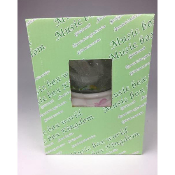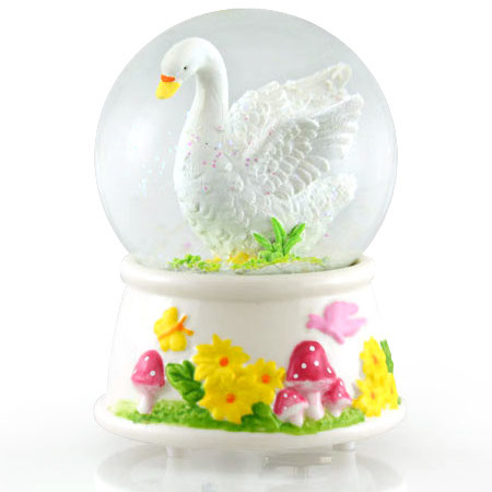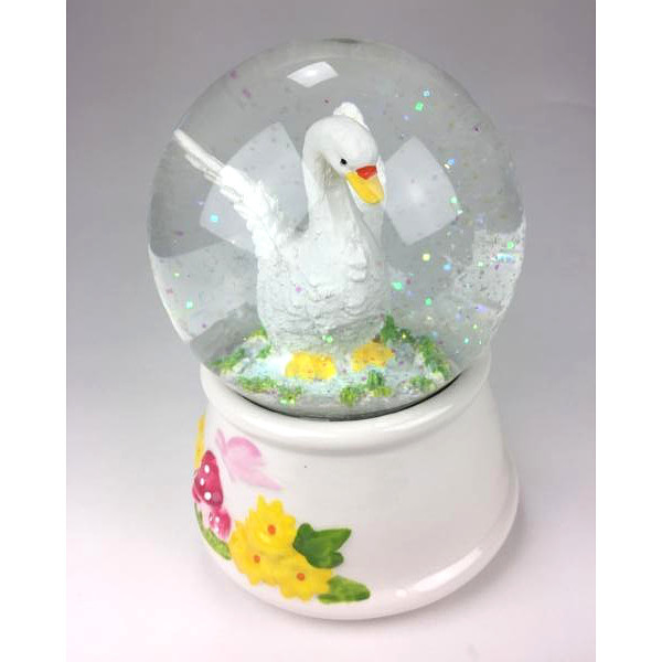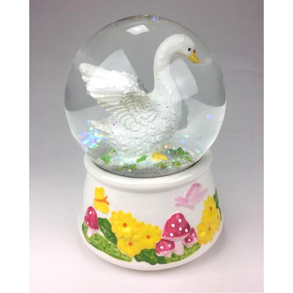 Muziekdoos met een zwaan in een glazen waterbol waarin het sneeuwt als je er mee schudt. De sneeuwbol is geheel uitgevoerd in glanzend wit en gedecoreerd met enkele bloemen en paddenstoelen in kleurrijke tinten. Na het opwinden van het mechanisme met de vleugelmoer aan de onderzijde, klinkt de melodie.