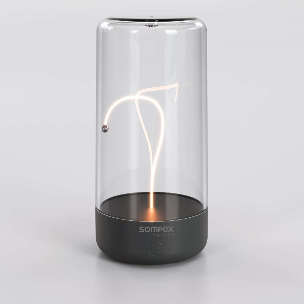 Ervaar modern design en innovatieve verlichtingstechnologie met de nieuwe PULSE tafellamp van het Duitse kwaliteitsmerk Sompex. De LED gloeidraad van het PULSE lampje lijkt in de lucht te zweven zonder extra ondersteuning. Bij nadere inspectie zie je dat het stalen balletje aan het uiteinde van de gloeidraad wordt aangetrokken door een magneet die in de kunststof behuizing is aangebracht. Door voorzichtig te schudden kan de gloeidraad van de magneet worden losgemaakt en zowel brandend als niet brandend worden bewogen. Zo kan de gloeidraad spelenderwijs van vorm veranderen. Klaar met spelen, dan kan de armatuur worden omgekeerd en de gloeidraad opnieuw rechtop worden ingesteld.