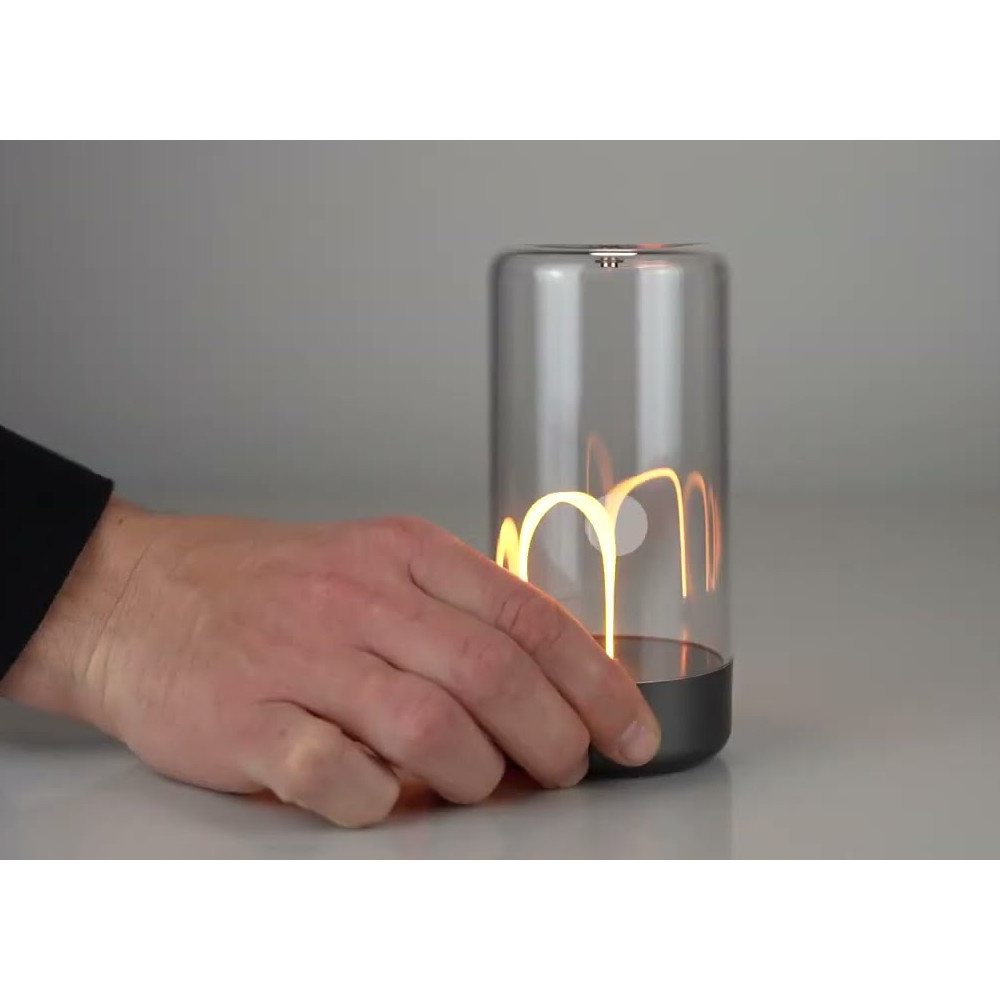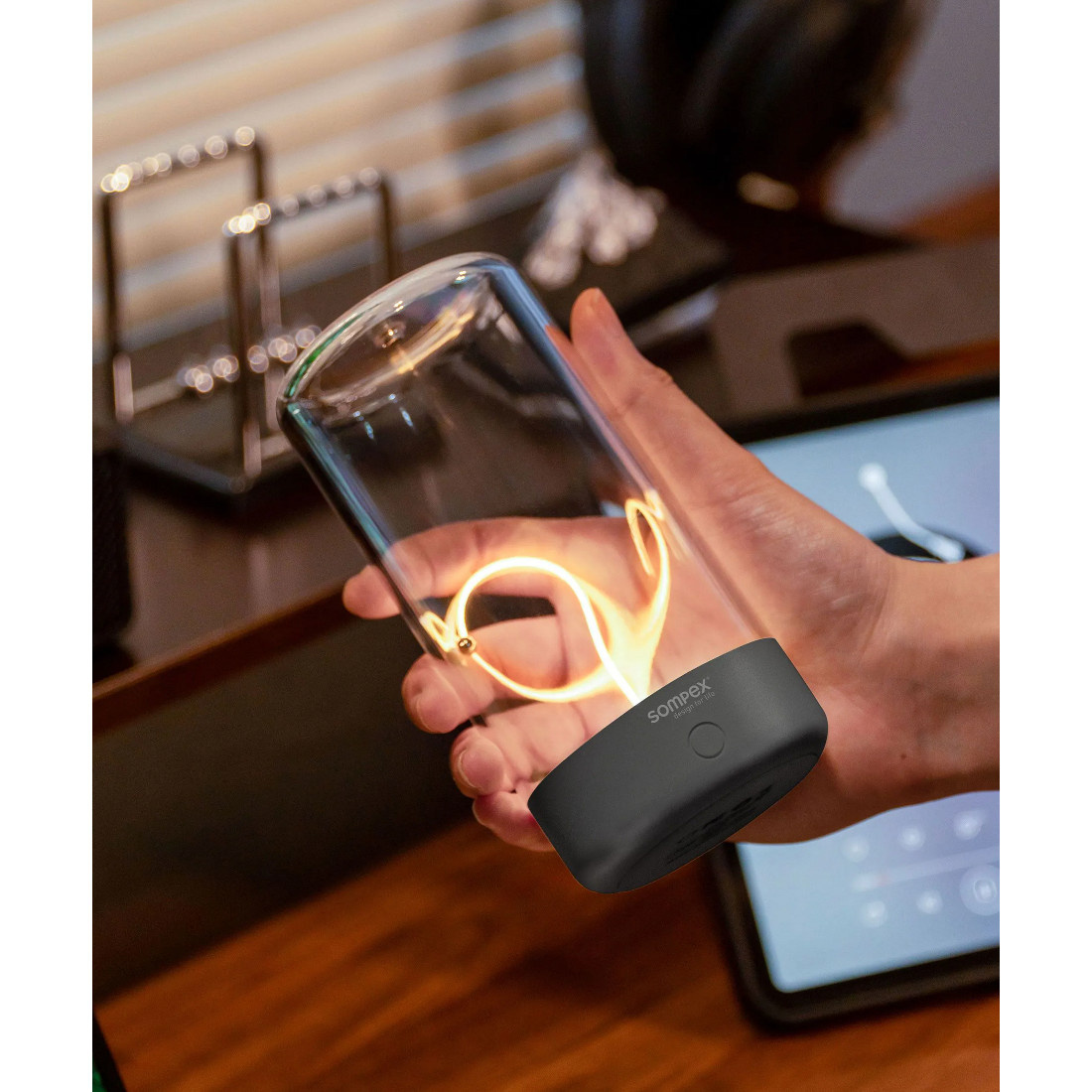 Ervaar modern design en innovatieve verlichtingstechnologie met de nieuwe PULSE tafellamp van het Duitse kwaliteitsmerk Sompex. De LED gloeidraad van het PULSE lampje lijkt in de lucht te zweven zonder extra ondersteuning. Bij nadere inspectie zie je dat het stalen balletje aan het uiteinde van de gloeidraad wordt aangetrokken door een magneet die in de kunststof behuizing is aangebracht. Door voorzichtig te schudden kan de gloeidraad van de magneet worden losgemaakt en zowel brandend als niet brandend worden bewogen. Zo kan de gloeidraad spelenderwijs van vorm veranderen. Klaar met spelen, dan kan de armatuur worden omgekeerd en de gloeidraad opnieuw rechtop worden ingesteld.